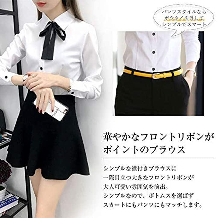 ホワイトのブラウスにブラックの リボンがかわいいボウタイ付きの長袖シャツは着回しのきくヘビロテアイテムです。