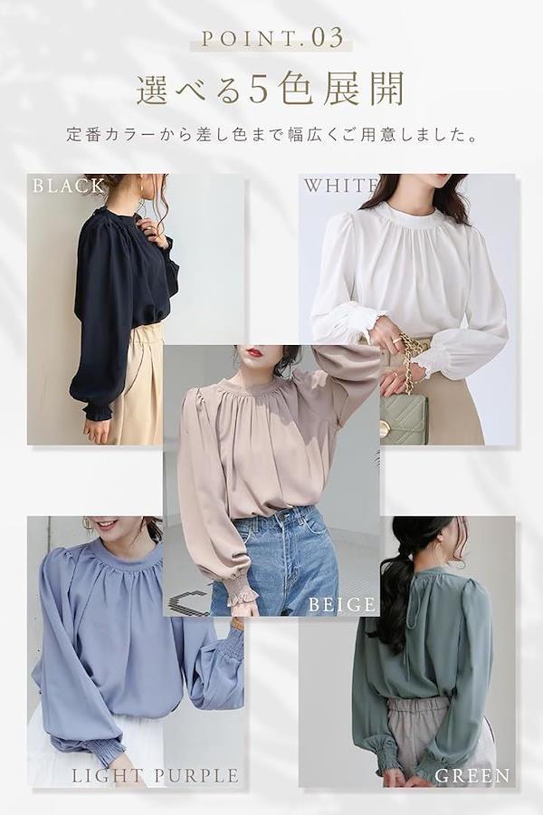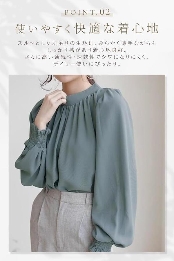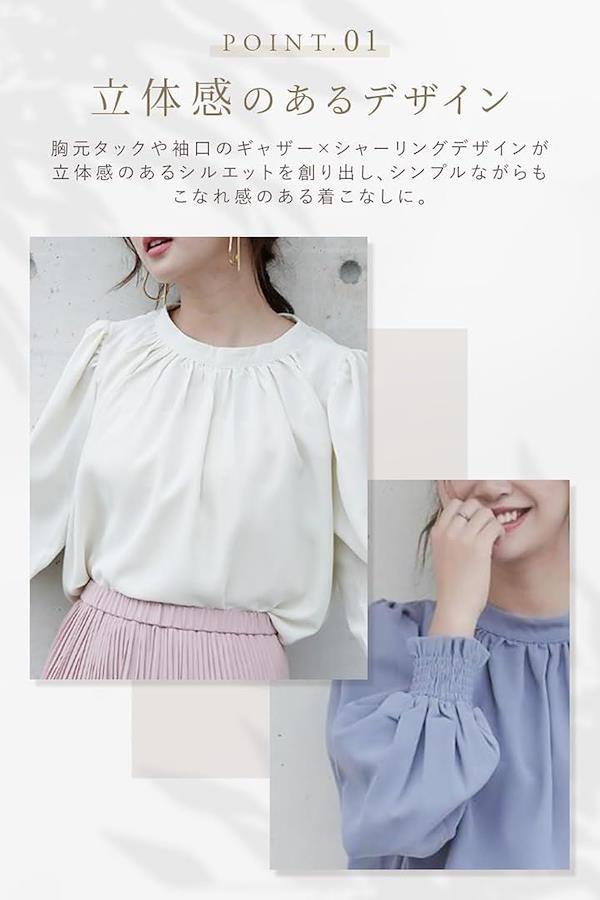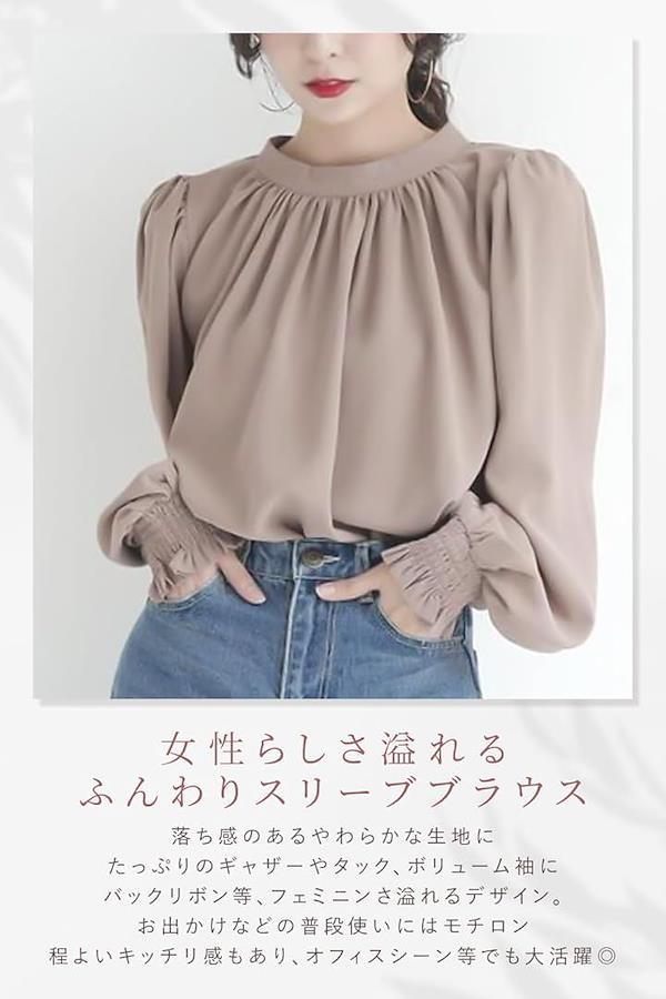 ポイント(1):女性らしさ溢れるふんわりスリーブブラウス。落ち感のあるやわらかな生地にたっぷりのギャザーやタック、ボリューム袖にバックリボン等、フェミニンさ溢れるデザイン。