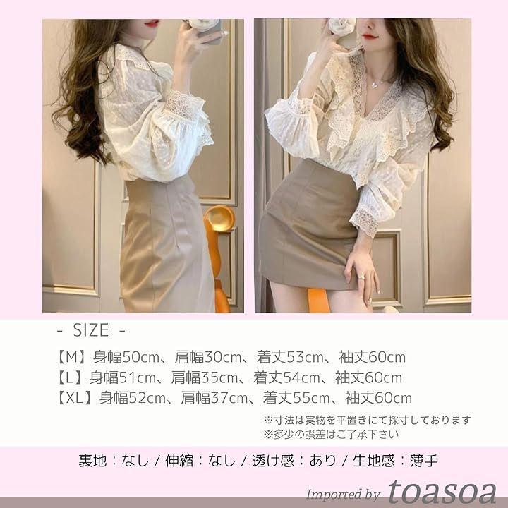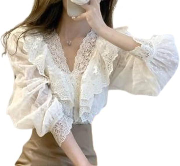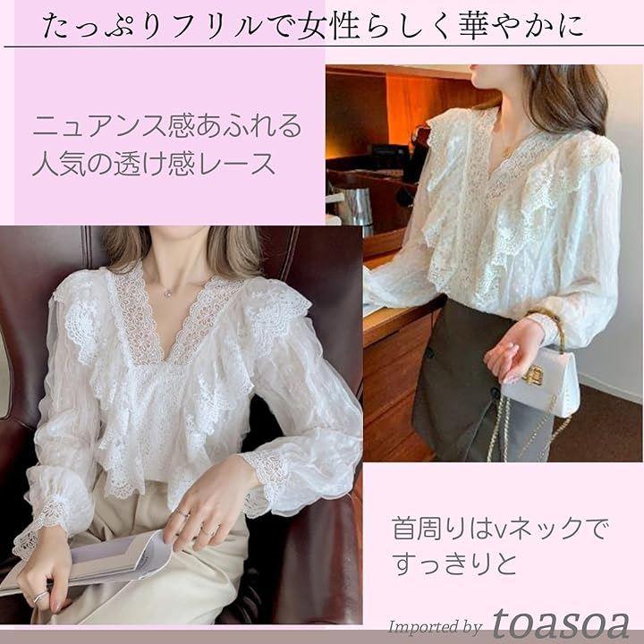 vネックの襟元と大きいフリルが特徴的なレース ブラウス トップス。