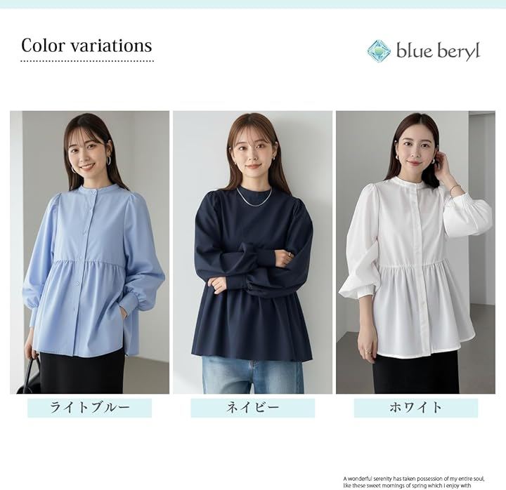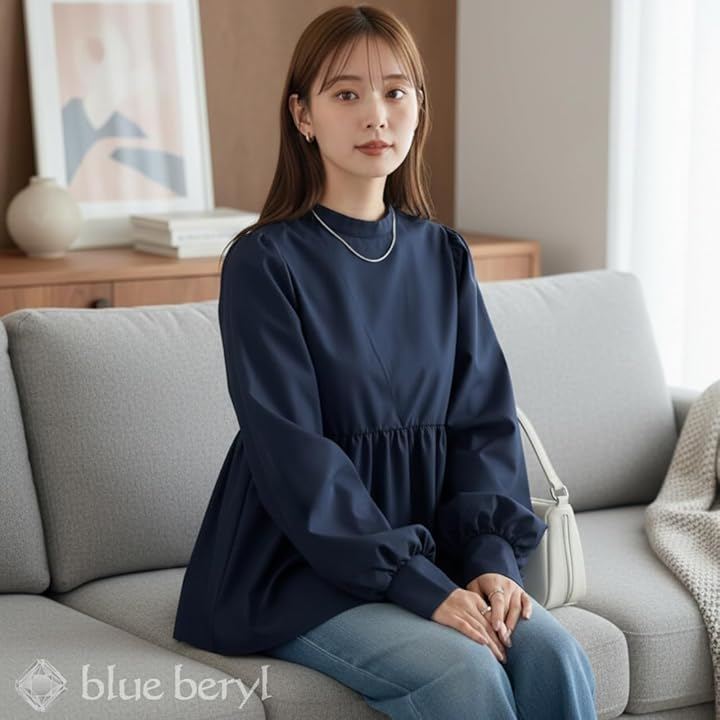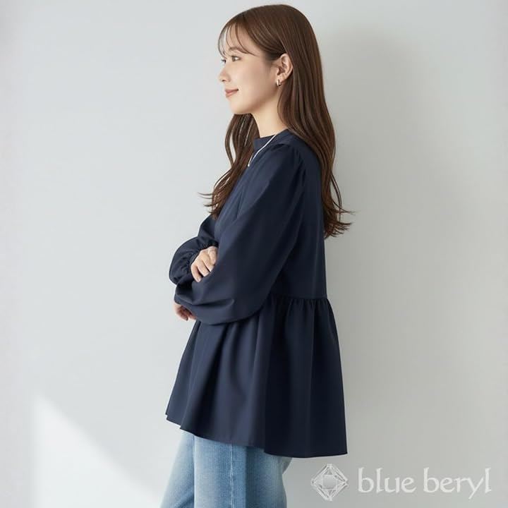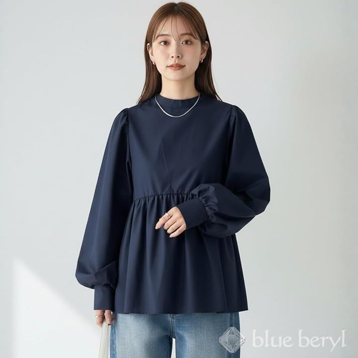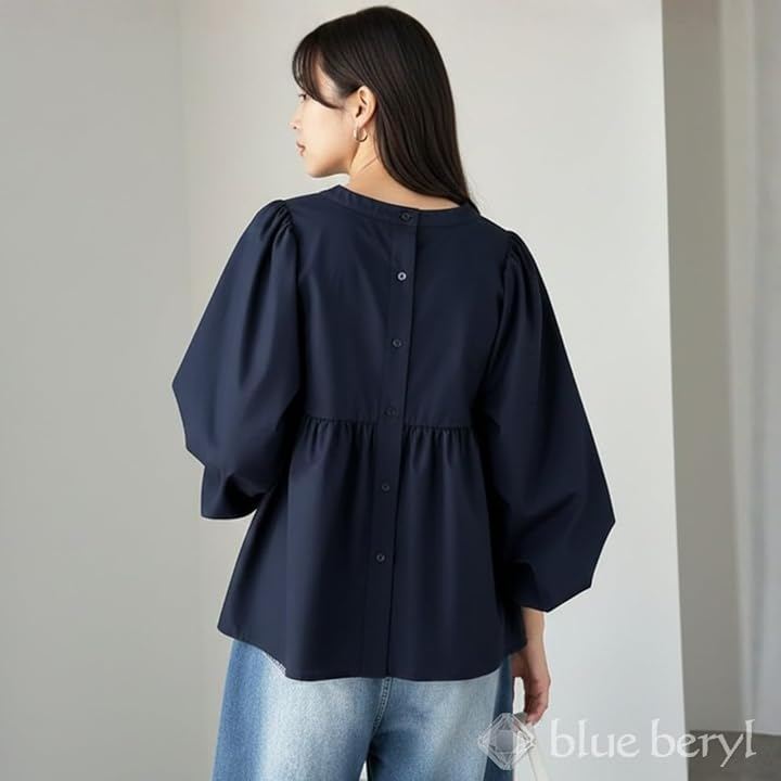 肩には控えめなギャザー、袖はボリュームのあるバルーンスリーブに仕上げ、袖口はカフス仕様で全体を引き締めています。