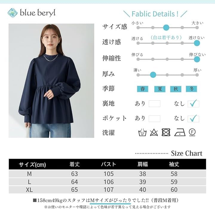 着丈/バスト/肩幅/袖丈 M: 63/105/38/58 L: 64/106/39/59 XL: 65/107/40/60 *158cm/49kgのスタッフの場合:Mがジャストサイズでした(普段M着用)