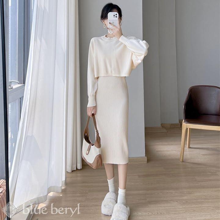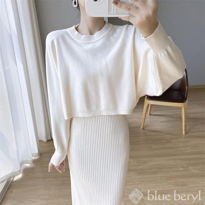 「優しいテクスチャーのニット素材」 程よいフィット感のあるノンスリーブのリブニットワンピースに、ゆったりとしたショート丈のニットトップスを合わせたセットアップアイテム。