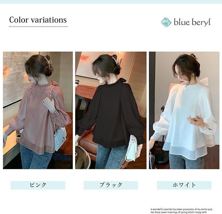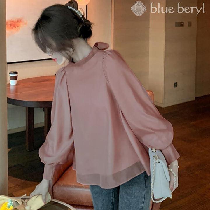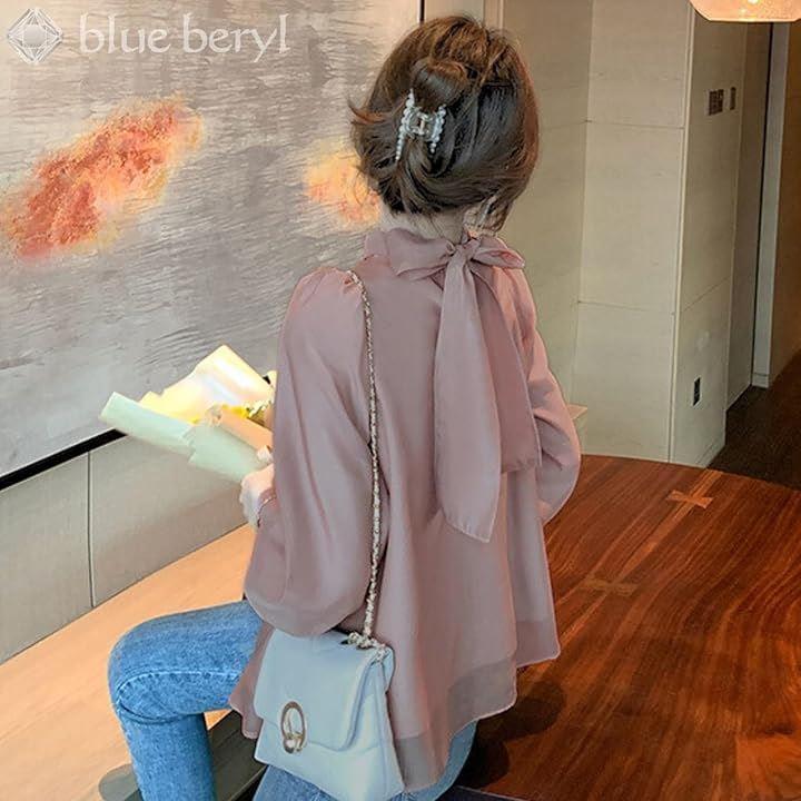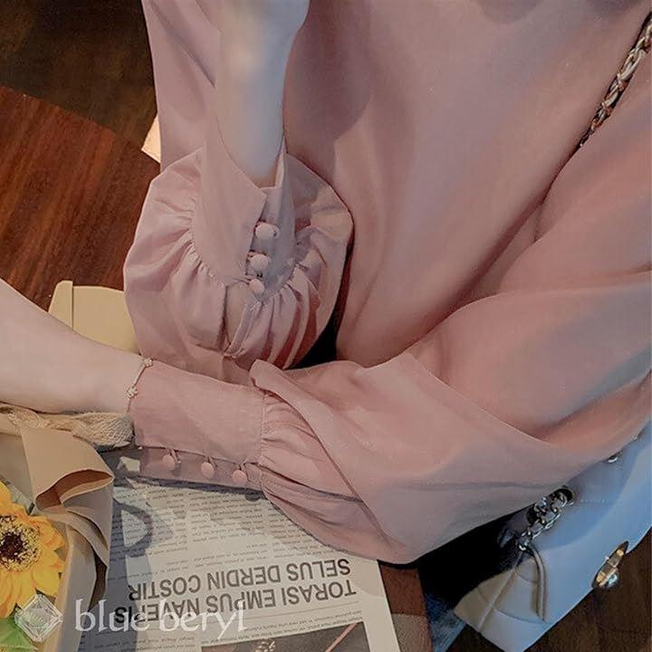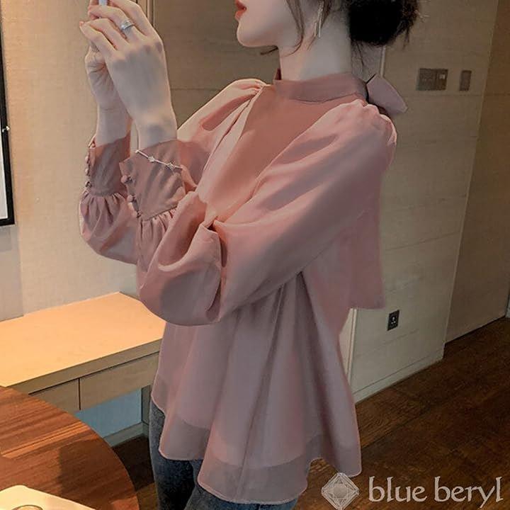 Blue Beryl Women's Blouse with Back Ribbon, Chiffon, Flared, Puff Sleeves, Long Sleeves, Stand-Up Collar, Covered Buttons, Cuffs, BB025