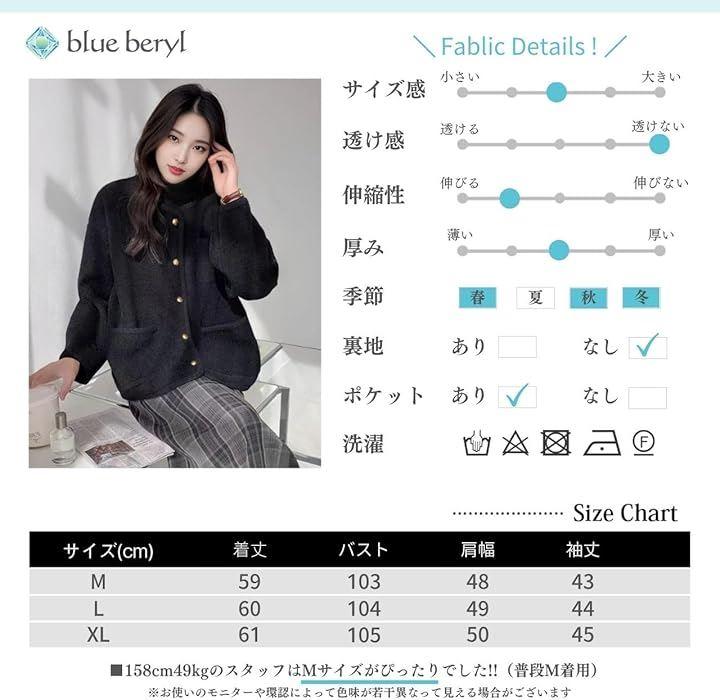 Blue Beryl Women's Boa Jacket, Collarless, with Pockets and Gold Buttons, Loose Fit, Casual, Warm, Lightweight, and Cold Protection, Popular for Commuting and School, BB088-BK-L