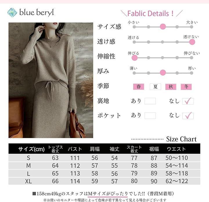 優しげなブラウン、ベージュのニュアンスのあるカラーに、プレーンな編み地が素肌にも優しく心地いいニットセットアップです。