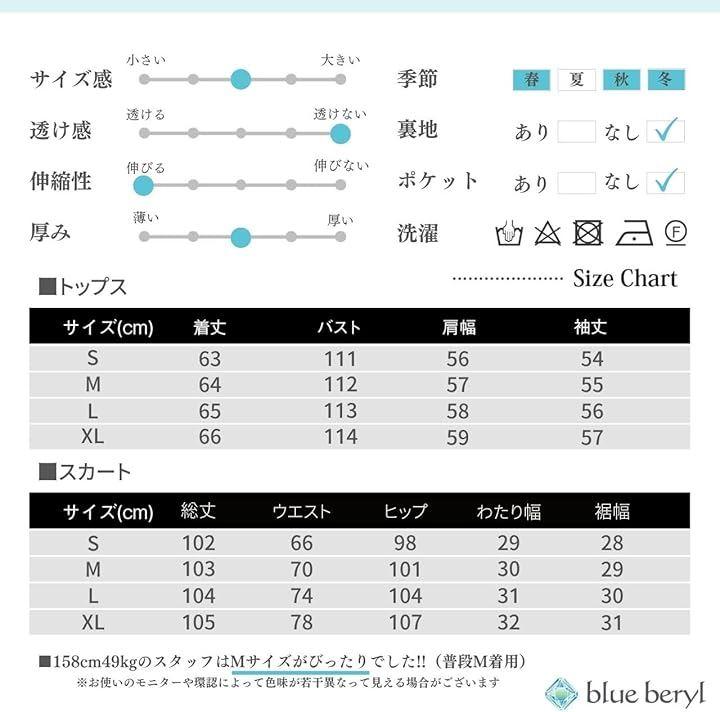 [トップス] 着丈/バスト/肩幅/袖丈 S: 63/111/56/54 M: 64/112/57/55 L: 65/113/58/56 XL: 66/114/59/57 [スカート] 総丈/ウエスト/ヒップ/わたり幅/裾幅 S: 102/66/98/29/28 M: 103/70/101/30/29 L: 104/74/104/31/30 XL: 105/78/107/32/31 *158cm/49kgのスタッフの場合:Mがジャストサイズでした(普段M着用)