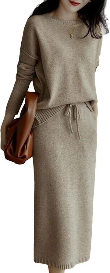 優しげなブラウン、ベージュのニュアンスのあるカラーに、プレーンな編み地が素肌にも優しく心地いいニットセットアップです。