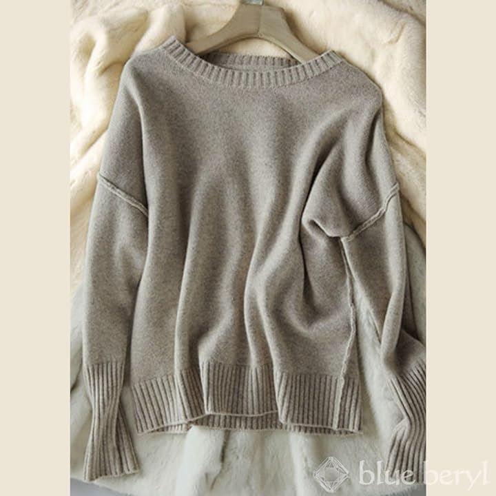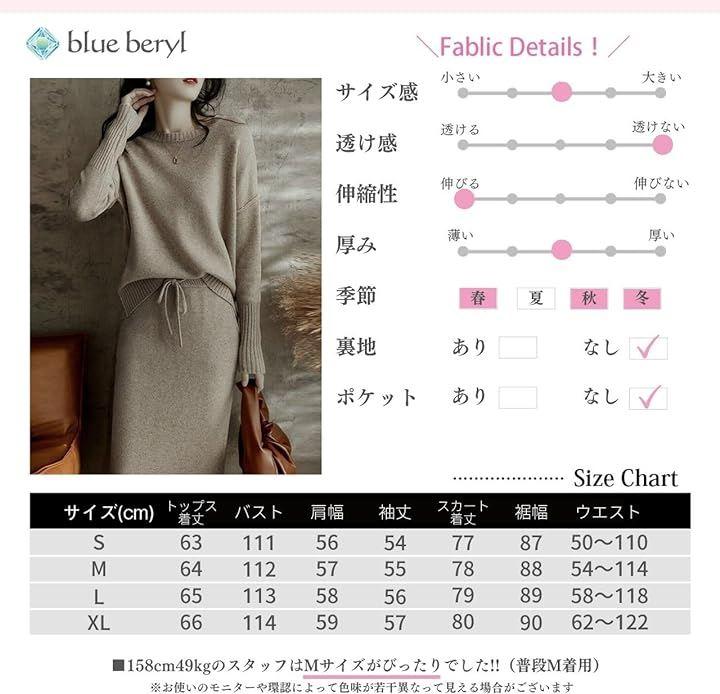 優しげなブラウン、ベージュのニュアンスのあるカラーに、プレーンな編み地が素肌にも優しく心地いいニットセットアップです。