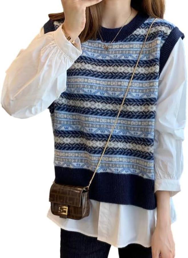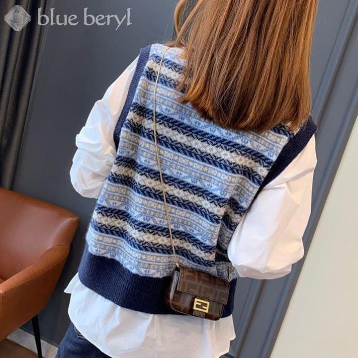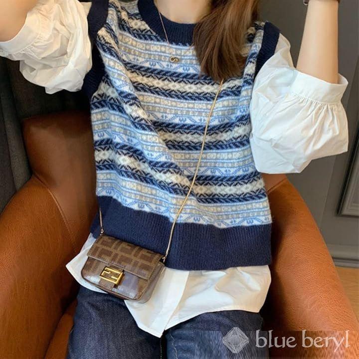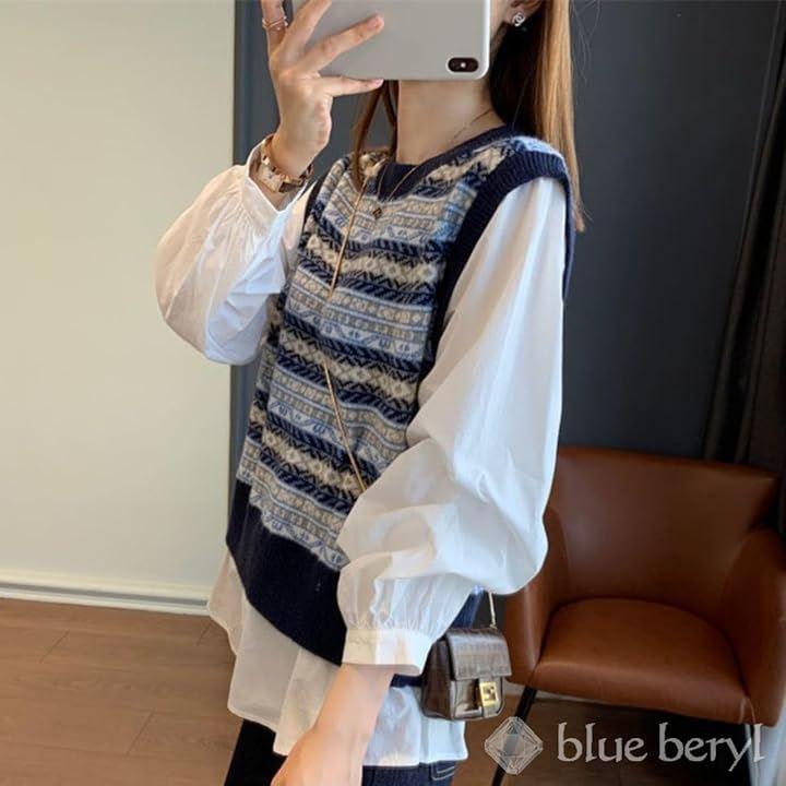カジュアル感のあるフェアアイル柄のニットベストに、ふわりとボリューム感のあるバルーンスリーブ、そしてベストの下からちらりとのぞくシャツの裾が、華やかなフェミニンさをプラスします。