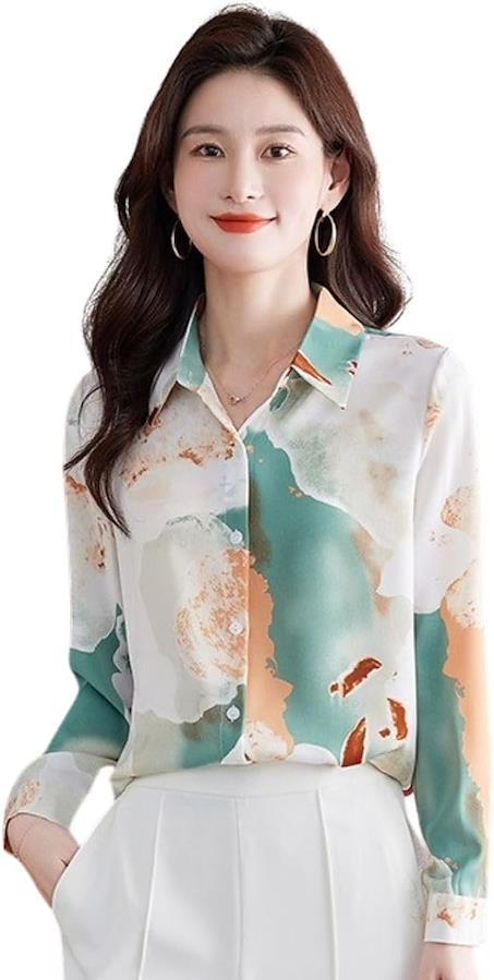 「アートのような色彩が映える、大人の華やぎブラウス」 淡いトーンに重ねた抽象的なカラーが印象的な一枚。