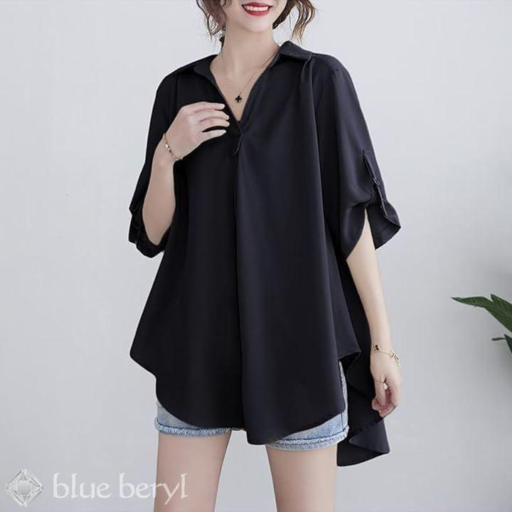 スキッパータイプの深めに空いた胸元が、Vカットを強調して顔周りをスッキリシャープに演出。