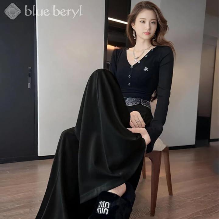 床に流れるようなロング丈が脚長効果を引き立て、足元のシューズとのバランスで印象を自在に変えられます。