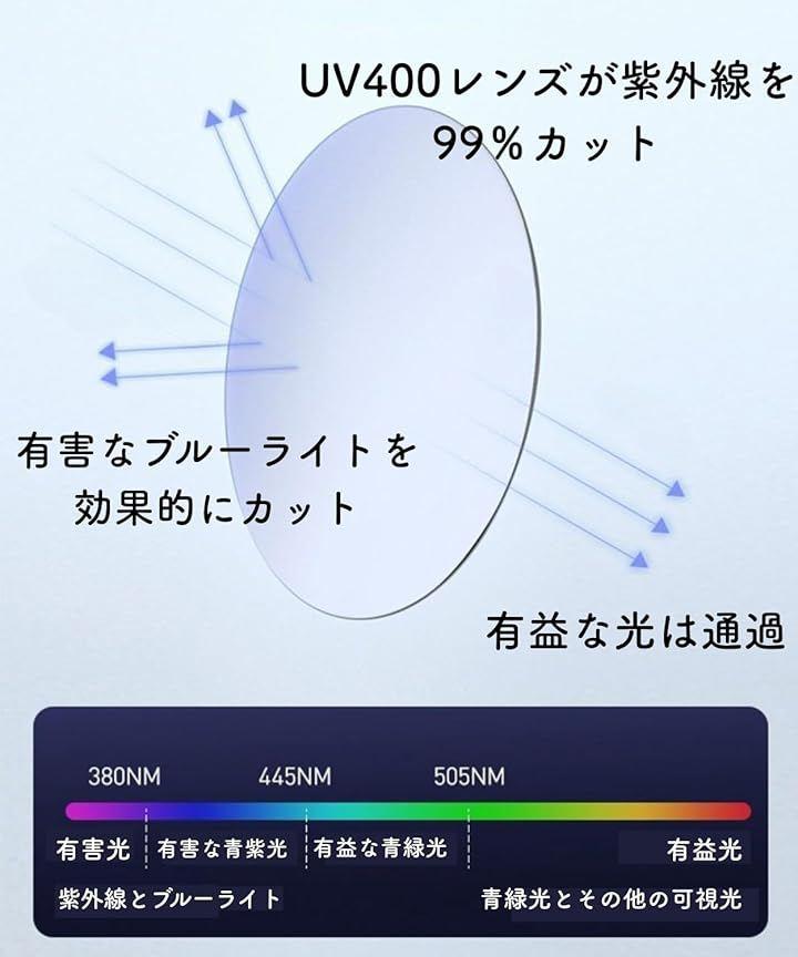 「これ1本でOK。室内外でかけ替え不要の調光レンズ」 おしゃれな伊達めがねが、屋外では紫外線から目元を守るサングラスに早変わり、UV400レンズが紫外線を99%以上カットし眩しさを抑え大切な瞳を保護します。