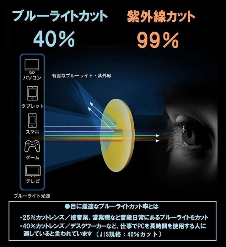 「ブルーライトカット率JIS規格40%」 40%カットレンズは、デスクワーカーなど、仕事でPCを長時間を使用する人や、eスポーツやゲーマー・スマホを長時間使う方の為に適したカット率です。