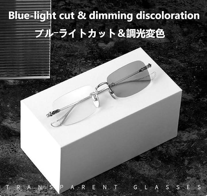 (ブル―ライトカット加工が施してあるためよく見るとイエロー味がかっています) 外出時の晴天下では約30%の濃度まで変色いたします。