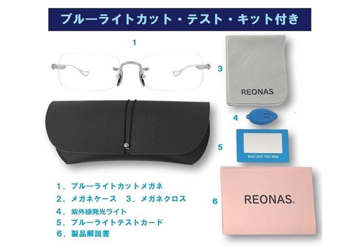 「安心の製品セット」 付属品:メガネ本体・メガネケース・メガネ拭きの他に、紫外線変色テストとブル―ライトカットをテストするためのミニブル―ライトと検査カードを付属しました。
