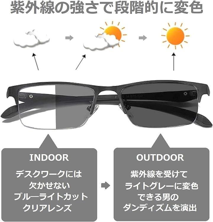 ・「ビジネス/戸外の2WAY使用」パソコンでのお仕事には欠かせないブル―ライトカットと外出時に太陽光を受けると変色する調光機能を備えた2WAY仕様のレンズを搭載しています。