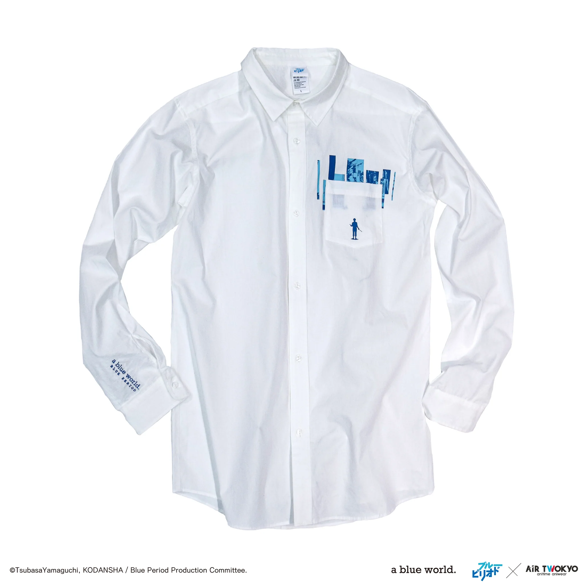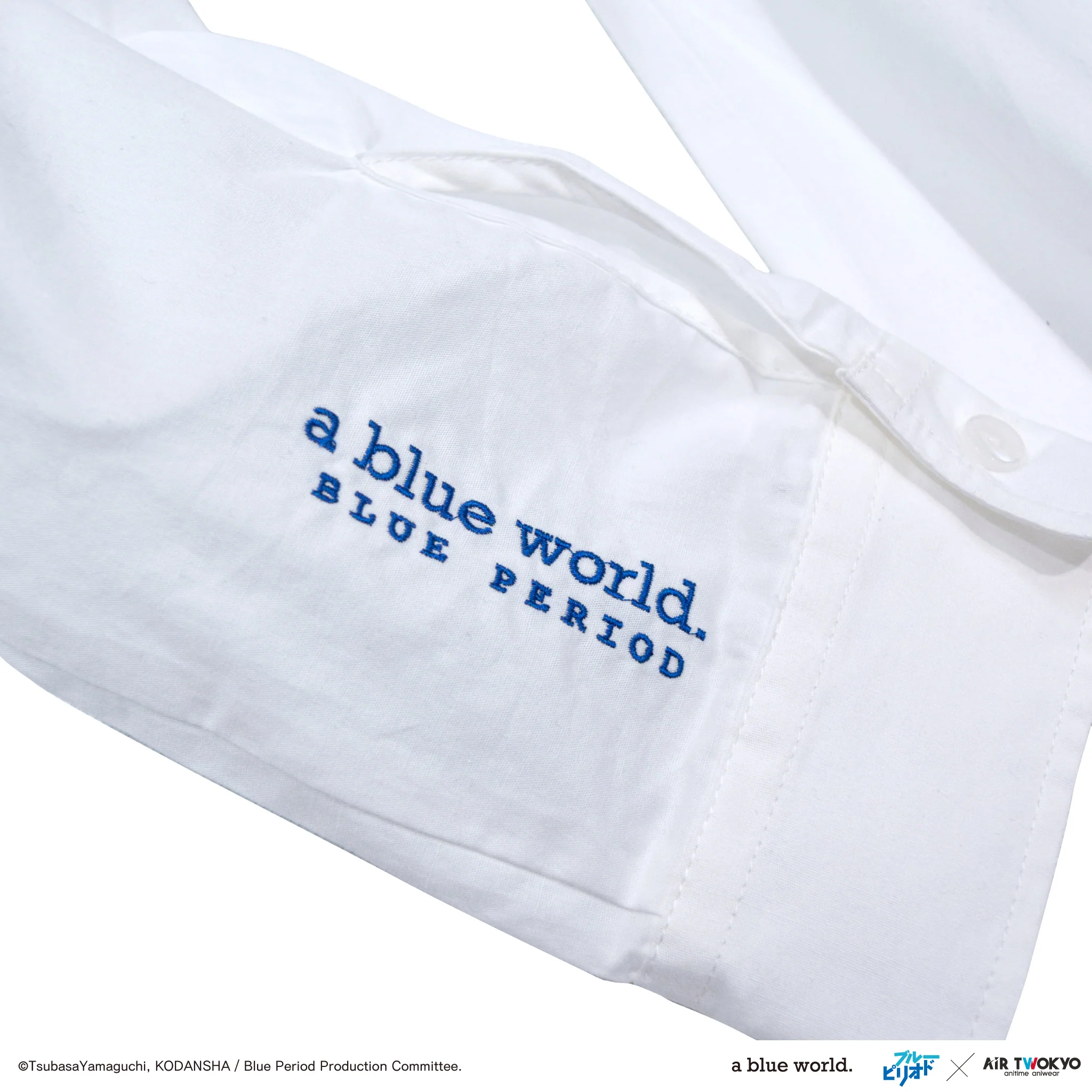矢口八虎が着用している白シャツをモチーフに再構築した商品。左胸には八虎の表現したい渋谷、“青い世界”を表現し、右袖にはa blue worldと刺繍加工を施している。シルエットは着丈を長くしており、カジュアルにも、またインする事でキレイ目にも使う事が出来、着回し力抜群の1枚。男性、女性問わず着用できる1枚です。生地は日本メーカーの生地を用いており、洗濯してもすぐに型崩れしない生地。(縫製、加工は中国)
