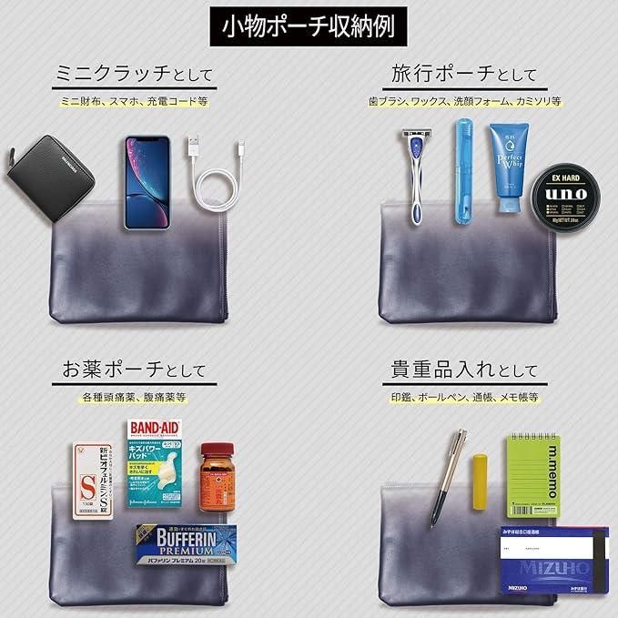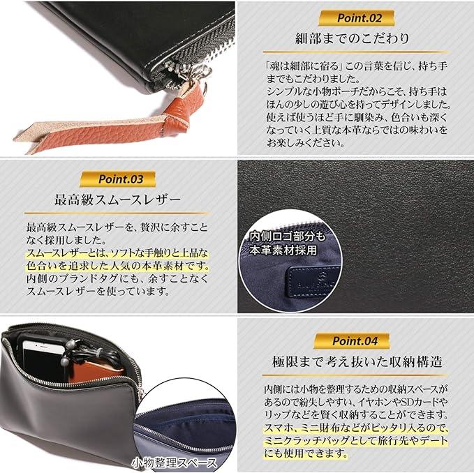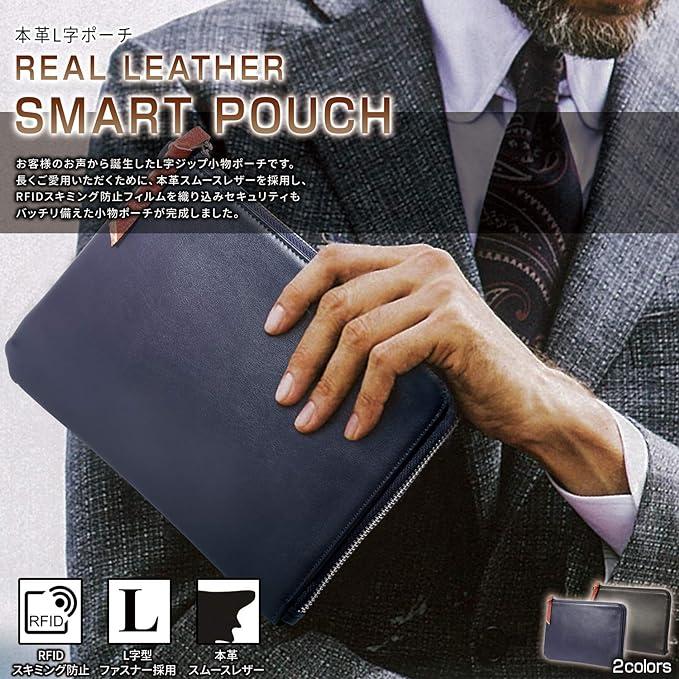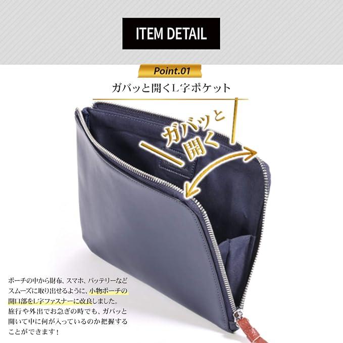 ■商品説明?【 こんなお悩みありませんか? 】 「よくあるポーチではあまり開かないから中身が見づらい…」「100均のポーチを使っているけど、ちょっといいポーチに変えたい」「セキュリティ面でも安心できるポーチが欲しい」こんなお悩みありませんか?急いでいる時、チャックをガバッと開いて一瞬でポーチの中身を確認したいですよね。会社でポーチを出した時にちょっといいポーチでカッコよく見られたくないですか?そんなあなたに、BLUE SINCEREの本革L字ポーチをオススメします。【 徹底追及した使いやすさ 】 「ポーチのチャックが狭くて、中身が見にくくて取り出しづらい…」そんなお客様からの声を聞き、使いやすさを徹底的に追求し、開口部をL字ファスナーに改良しました。L字ファスナーになったことにより、ポーチの口がガバッと開くので、中が見やすく小物の出し入れも非常に簡単になりました。急いでいる時でも大きくガバッと開くので物を探すストレスが無くなります。また、ポーチの内側には小物を仕分けることができるスペースがあるので、家の鍵やイヤホン、リップなどポーチの中で迷子になりがちな小物を仕分けることができます。使いやすさに徹底的にこだわったBLUE SINCEREのポーチをぜひご体感下さい。【 特殊素材でセキュリティもバッチリ 】 キャッシュレス化が進み、現金を持ち歩かなくてもカードだけでお買い物ができる便利な時代になりました。ですが、犯罪の手口も多様化されて来ており、知らないうちにクレジットカードの情報を読み取られて悪用されてしまう、という犯罪も増えています。そんな恐ろしい犯罪からあなたの個人情報をしっかり守れるよう、ポーチの素材にはクレジットカードから発せられる電波を遮断できる「RFIDブロッキング専用フィルム」を織り込みました。ポーチの中にクレジットカードを入れておけば、電波を遮断できるのでスキミングされることを未然に防ぎます。これで安心して旅行やお出かけを楽しむことができます。【 使い方はあなた次第 】 ポーチのサイズは23 × 16㎝となっているので、小物ポーチとしてはもちろん、ミニクラッチバッグとして結婚式やデートで使用したり、旅行ポーチとして洗顔や歯ブラシを入れたり、カバンの中を整理するためのバッグインバッグとして使用したりと、あなただけの様々な使い方ができます。丁度いいサイズ感でどんな場面でも活躍すること間違いなしです。 ?【 厳選した本革素材 】 長くご愛用していただけるよう本革素材の最高級スムースレザーを使用しました。使えば使うほど手に馴染み、色合いも深くなっていく上質な本革ならではの味わいをお楽しみください。【 サイズ 】 23 × 16 × 1㎝ 重量:170g ?【ご注意】 ※ BLUE SINCEREが製造・販売する製品は知的財産権の取得を随時行っております。 ??【生産国】バングラデシュ(現地の自社工場にて生産しています)