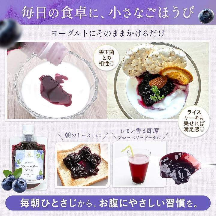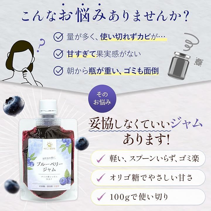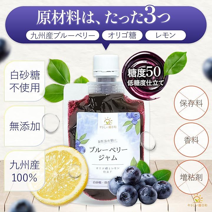 白砂糖ゼロ、オリゴ糖だけで仕上げた九州産ブルーベリージャム 「毎日食べるジャム、果糖ぶどう糖液糖などの添加物が気になる…」 「瓶のジャムは重くて捨てにくく、使い切れずにカビが生えてしまう」 そんなお悩みを持つ方のために生まれたのが、「やさしい腸日和 ブルーベリージャム」です。