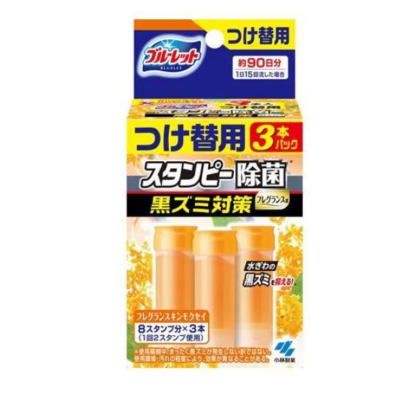 製品の特徴●小林製薬 ブルーレット スタンピー除菌 黒ズミ対策 フレグランス調●フレグランスキンモクセイ●便器表面に貼り付けておくだけで、心地よい香りが広がり、水ぎわのキレイを保ちます。●流すたびに薬剤が広がり洗浄します。●除菌(*)成分により水ぎわの黒ズミ発生を抑えます*。[*黒ズミの発生原因になる菌の繁殖を抑えます。ただし、すべての菌を除菌するわけではありません。使用環境・汚れの程度により、効果が異なることがあります。]●左右2か所に貼ることで効果を発揮します。●1回のスタンプで約1週間使用できます。(気温・水温・水量などにより、多少変化します。)●流れる水は無色です。●本品は浄化槽及び浄化槽内のバクテリアに影響を与えません。●品名:トイレ用合成洗剤●用途:陶器製洋式トイレの便器用