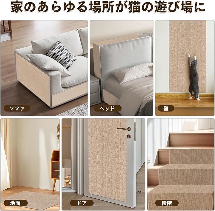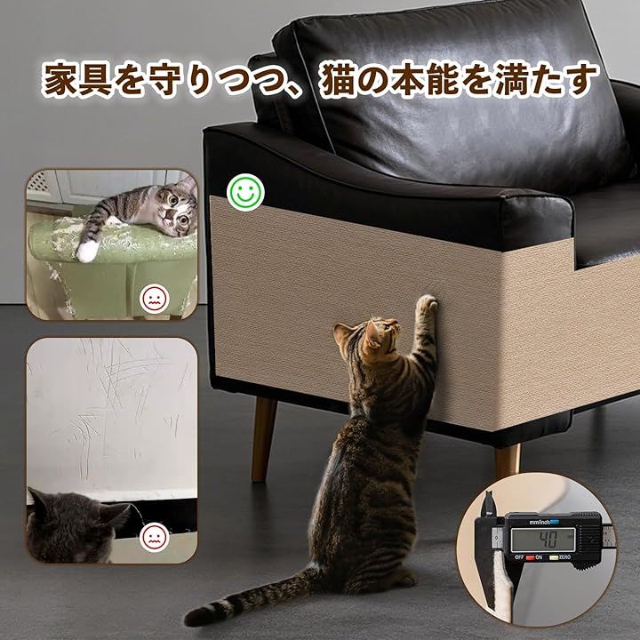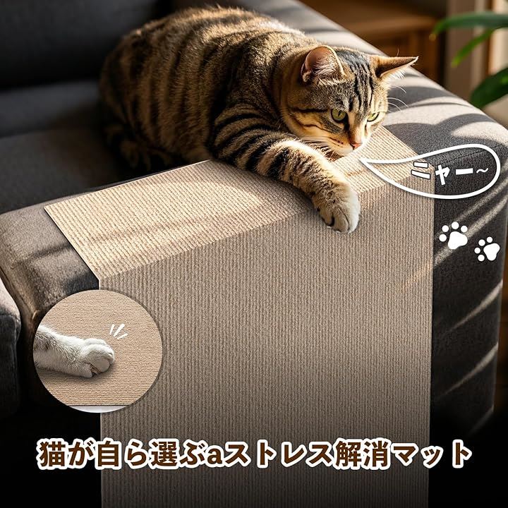 「家具・壁・床を守る猫の爪研ぎ専用設計」高密度ポリエステルで、猫の爪研ぎ行動をソファや壁面から誘導。