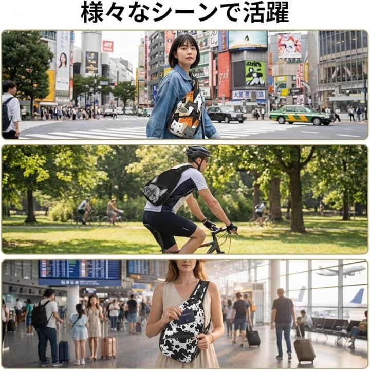 商品仕様1:デザインと使用シーン:本商品は、斜めがけで使用できるワンショルダータイプのボディバッグです。