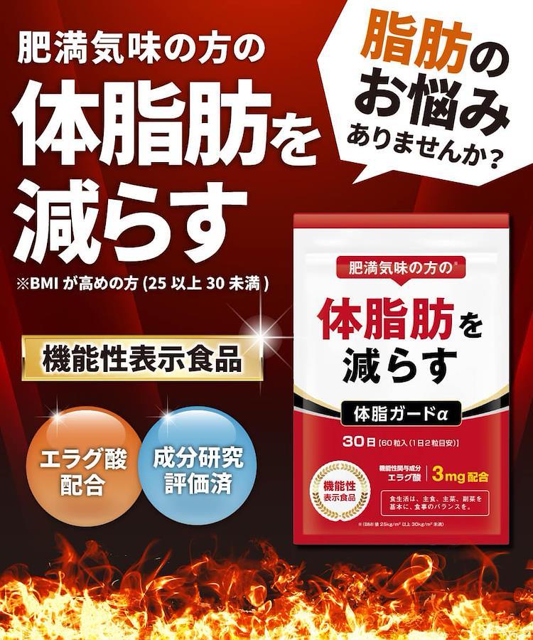 【体脂ガードα】 本品にはエラグ酸が含まれます。エラグ酸は肥満気味の方の体脂肪を減らす機能があることが報告されています。 【お召し上がり方】1日2粒を目安に水または、ぬるま湯で、噛まずにお召し上がりください。 食生活は、主食、主菜、副菜を基本に、食事のバランスを。