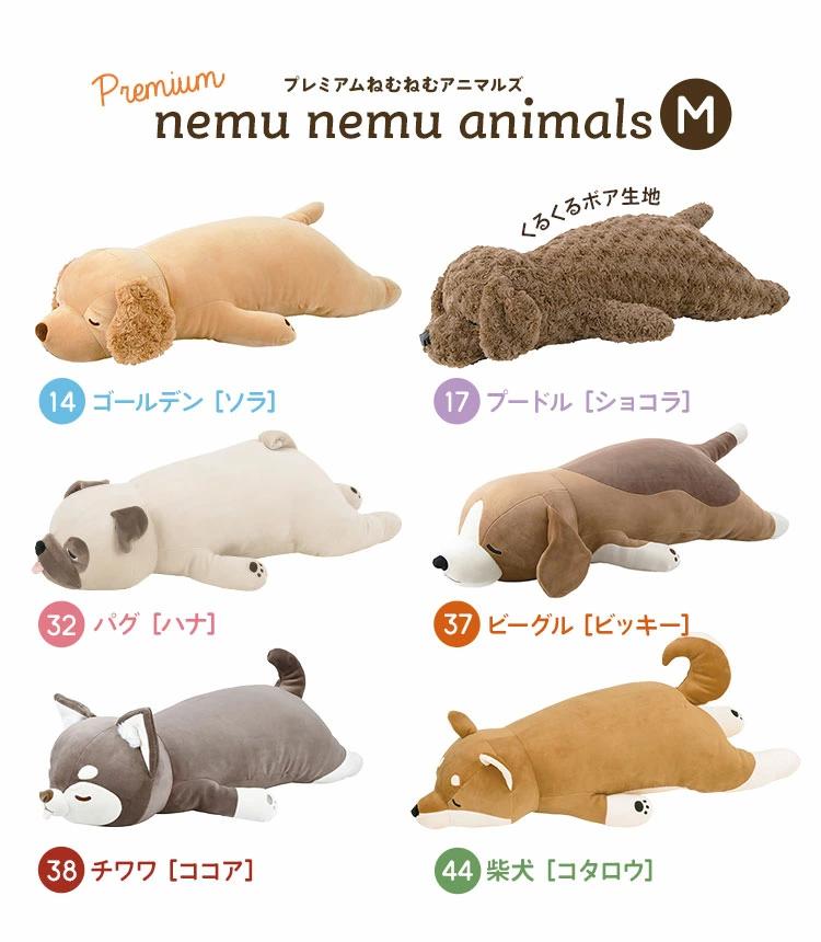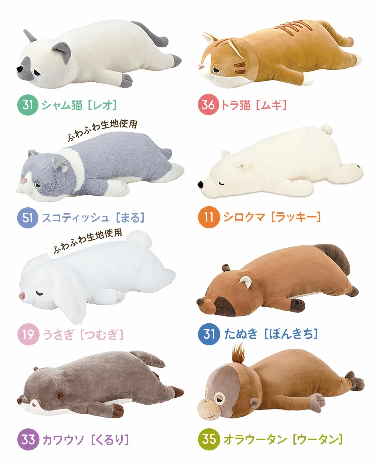 ■サイズ【犬】ゴールデン[ソラ] :長さ56×幅26×高さ14cmプードル[ショコラ] :長さ50×幅24×高さ12cmパグ[はな] :長さ52×幅23×高さ14cmビーグル[ビッキー] :長さ53×幅23×高さ14cmチワワ[ココア] :長さ54×幅27×高さ14cm柴犬[コタロウ] :長さ54×幅21×高さ14cm柴犬[コテツ] :長さ54×幅21×高さ14cmシュナウザー[ジョイ] :長さ49×幅22×高さ12cmブルドッグ[ブルル]: 長さ53×幅25×高さ13.5cmダックスフンド[チョコ]:長さ50×幅23×高さ13cm【猫】ミケ猫[ゆず]: 長さ49×幅21×高さ14cmスナネコ[スナコ] :長さ54×幅27×高さ14cmシャム猫[レオ]: 長さ54×幅25×高さ13cmトラ猫[ムギ]: 長さ54×幅25×高さ13cmスコティッシュ[まる]: 長さ50×幅23×高さ13cm【その他】シロクマ[ラッキー]: 長さ53×幅23×高さ16cmうさぎ[つむぎ]: 長さ50×幅20×高さ13cmたぬき[ぽんきち] :長さ55×幅22×高さ16cmカワウソ[くるり] :長さ54×幅23×高さ16cmオラウータン[ウータン] :長さ54×幅25×高さ13cmトラ[ラム・テン] :長さ56×幅23×高さ12cmゴリラ[ボンゴ]:長さ50×幅32×高さ15cmパンダ[リンリン]: 長さ53×幅23×高さ14cmうし[モーリー] :長さ55×幅23×高さ15cm