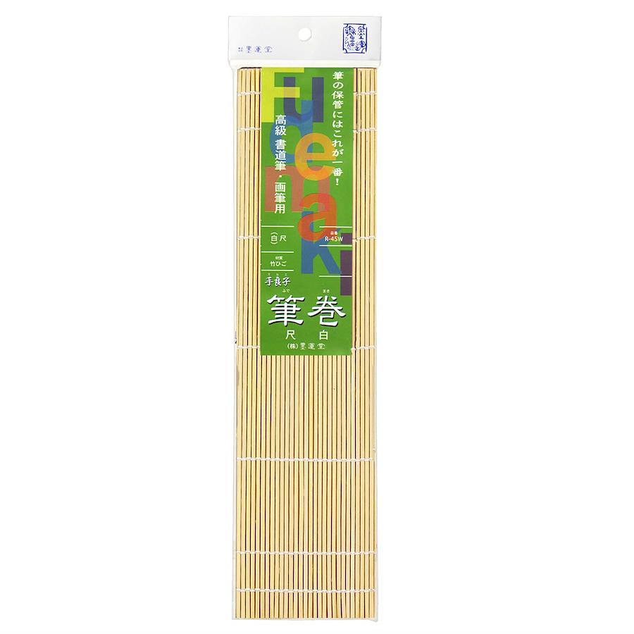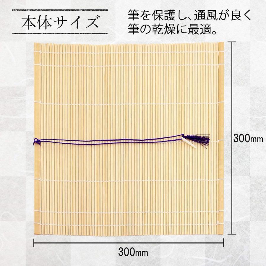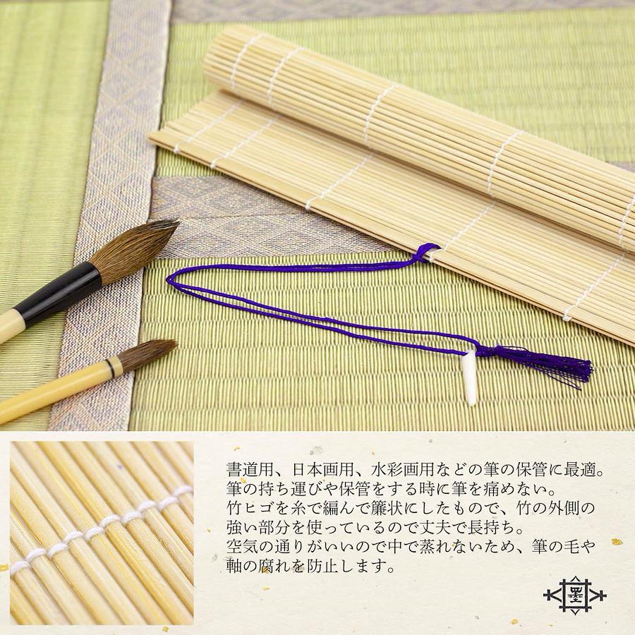 書道用、日本画用、水彩画用などの筆の保管に最適。筆の持ち運びや保管をする時に筆をいためない。竹ヒゴを糸で編んで簾状にしたもので、竹の外側の強い部分を使っているので長持ちする。空気の通りがいいので中で蒸れないため、筆の毛や軸の腐れを防止する。