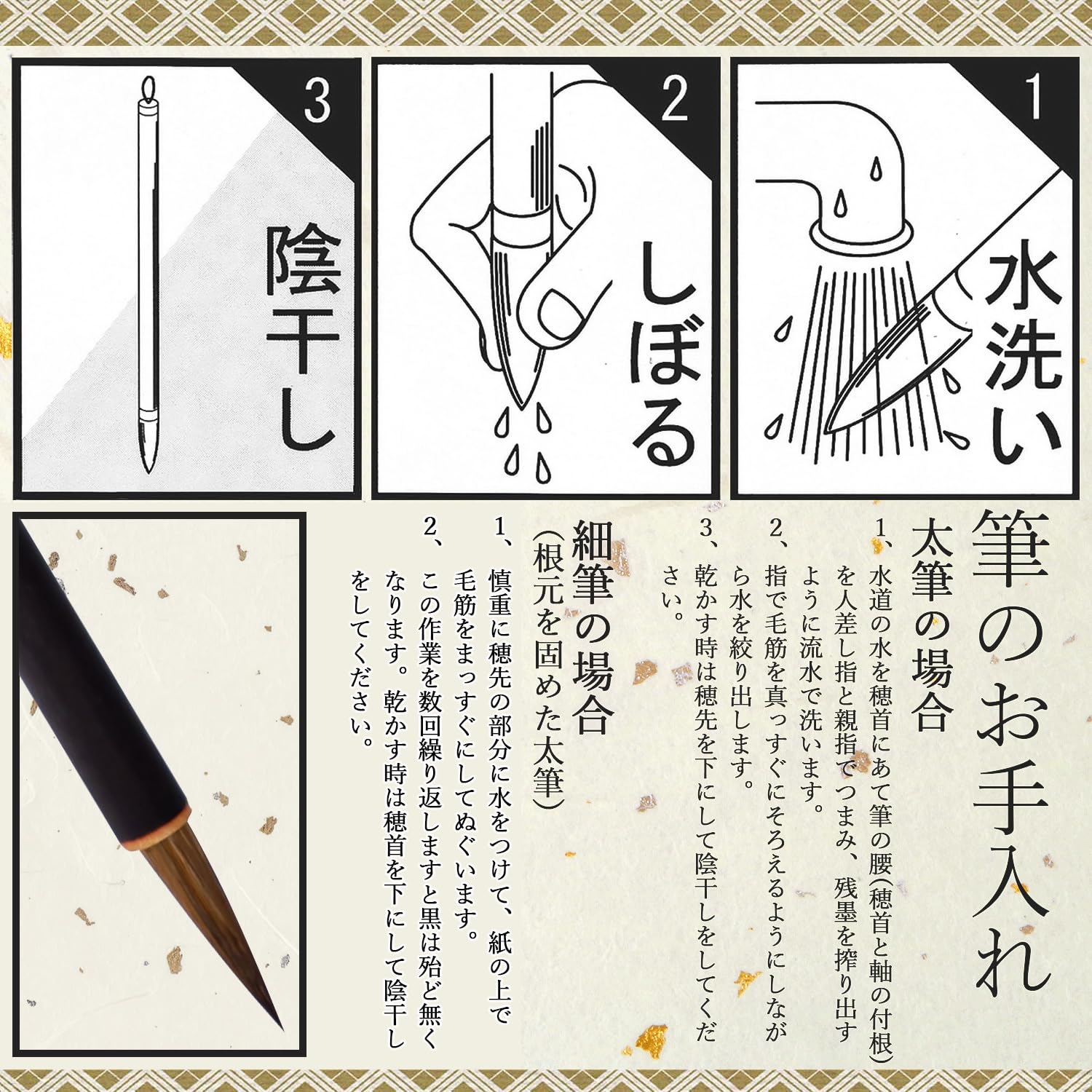 イタチ毛を使用し墨含みが良く先もよくきく。写経には最適。