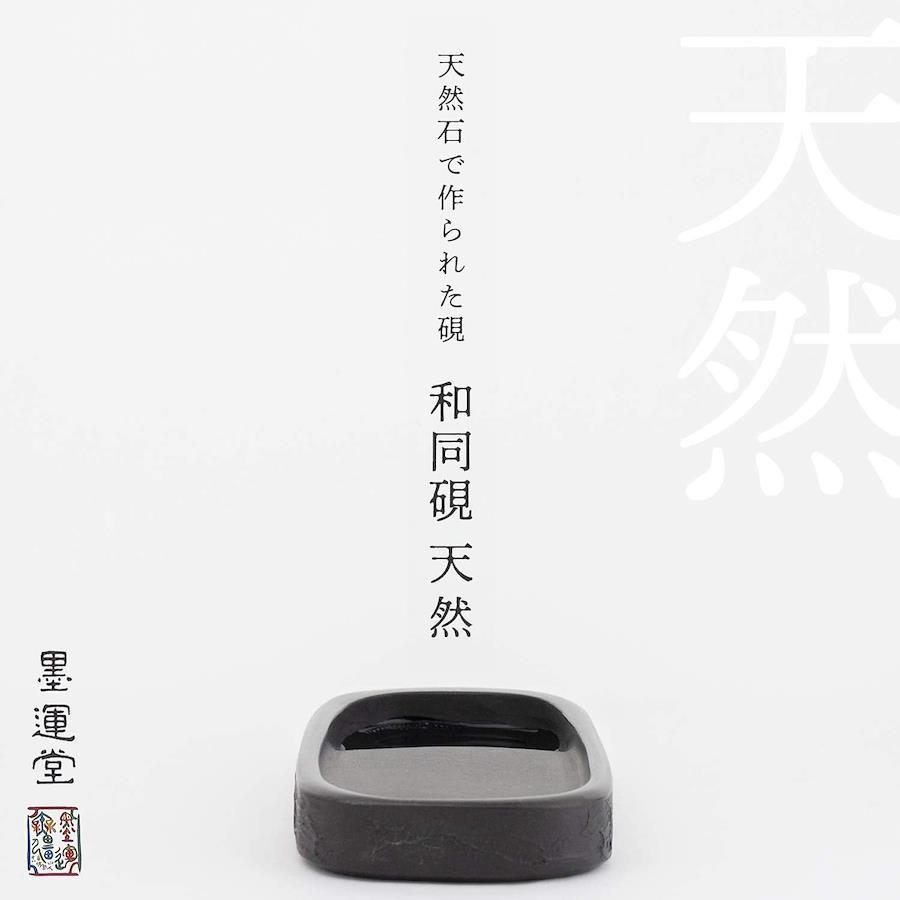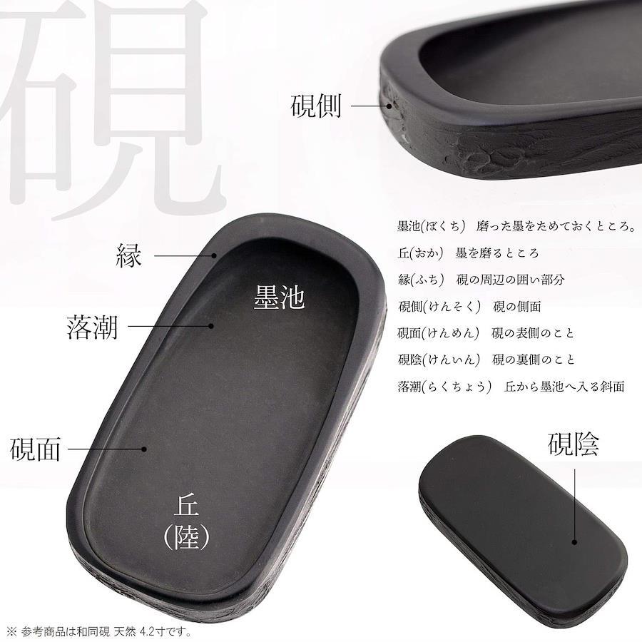 宮城県産出の雄勝硯を使っています。雄勝硯は黒色硬質粘板岩で、鋒鋩(墨を削るヤスリ状のもの)がきめ細かく密集している、磨り心地滑らかな天然小型硯です。「天然」とは外形を自然風に作硯していることをいいます。※天然石のため、硯面の模様・サイズ・柄等は一面一面異なります。