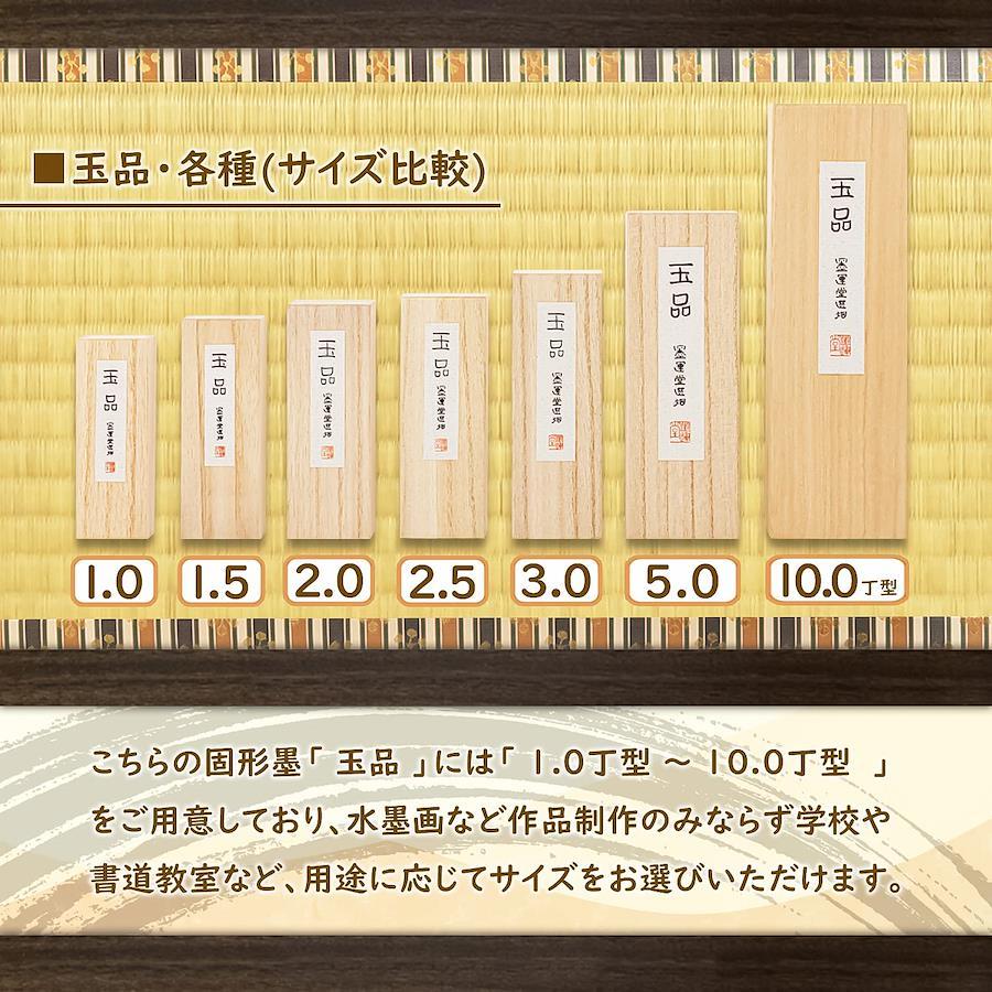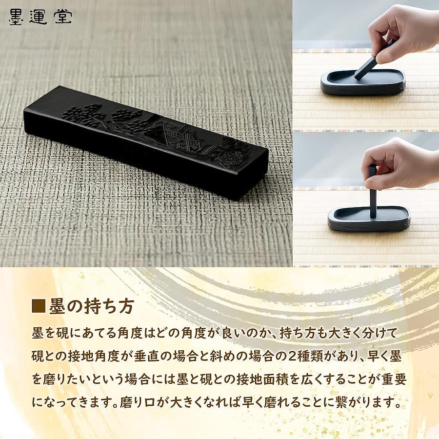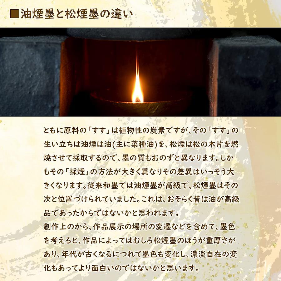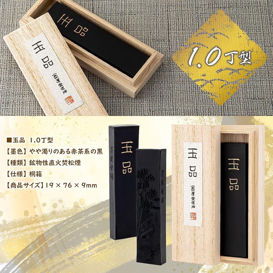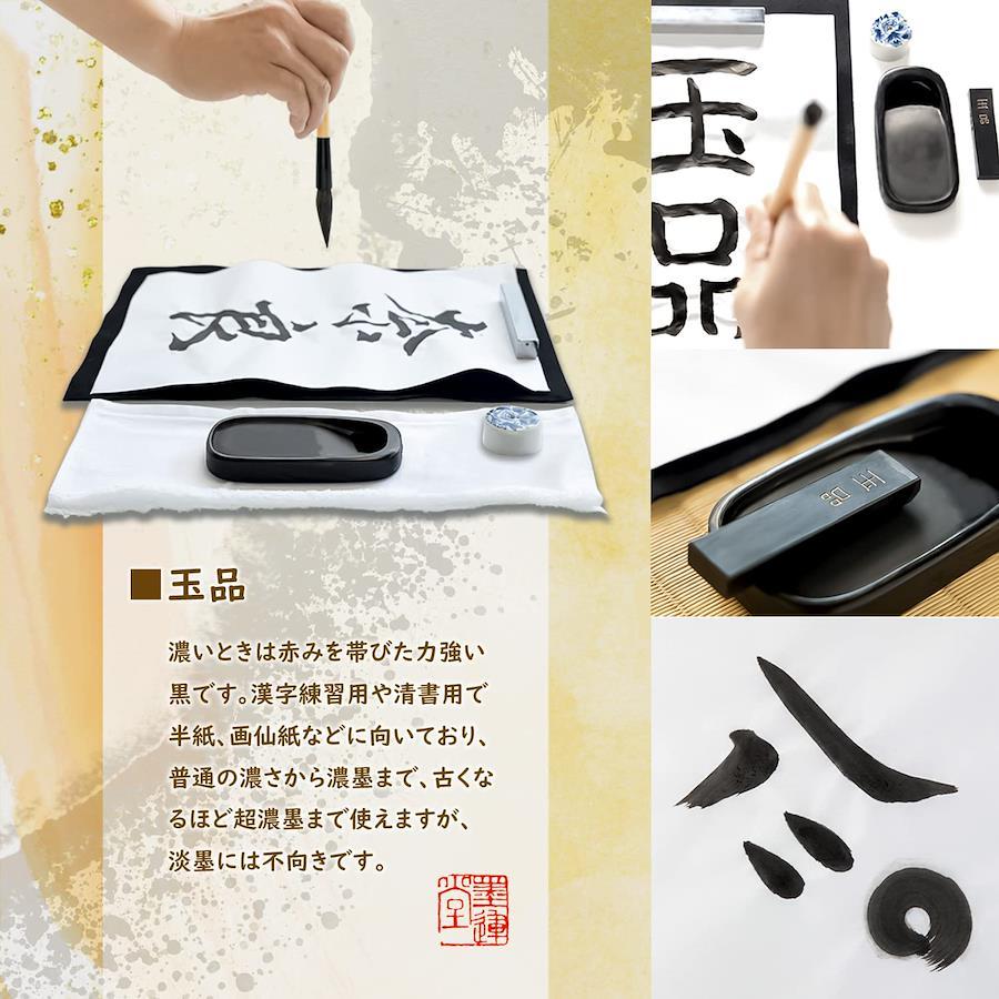 【玉品】漢字練習用、清書用で半紙、画仙紙向き。普通の濃さから濃墨まで、古くなるほど超濃墨まで使えるが、淡墨には不向き。作品用には陳玄の試用を推奨【墨色】 やや濁りのある赤茶系の黒【種類】鉱物性直火焚松煙【仕様】桐箱【商品サイズ】19×96×9mm【免責事項】メーカーによる商品リニューアルに伴いパッケージが変更が行われた場合、新パッケージでお届け致します事ご了承願います。