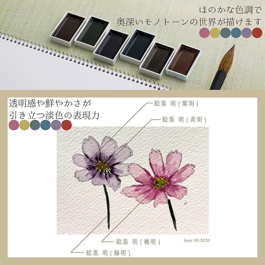 人気の絵墨に新たな6色が追加淡色で各色の透明度や鮮やかさが増す顔彩ほのかでやさしい色が一番の魅力通常の顔彩同様に使用でき、初心者からプロの方まで手軽に活用できる「墨を生かした気品ある明度と彩度が調和した墨色世界」