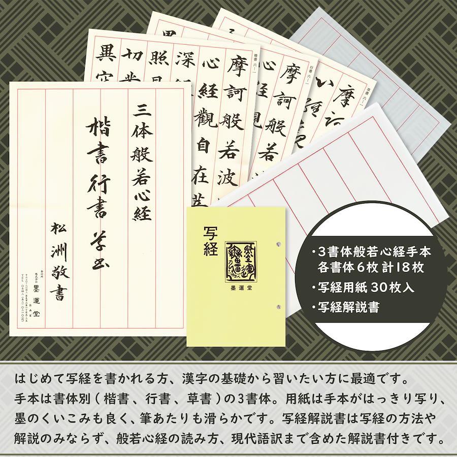 初めて写経を書かれる方、漢字の基礎から習いたい方に最適。美しい文字が書ける。さらに手本は書体別(楷書、行書、草書)になっているので習いやすく、より日常性の高い行書・草書を自分のものにすることができる。