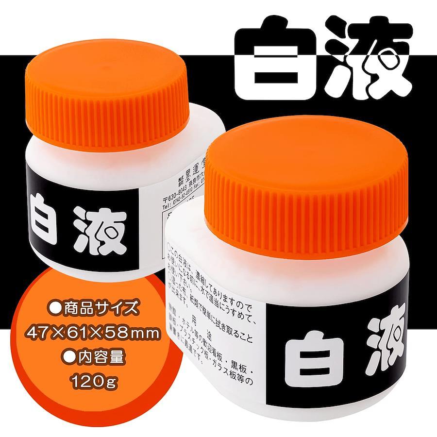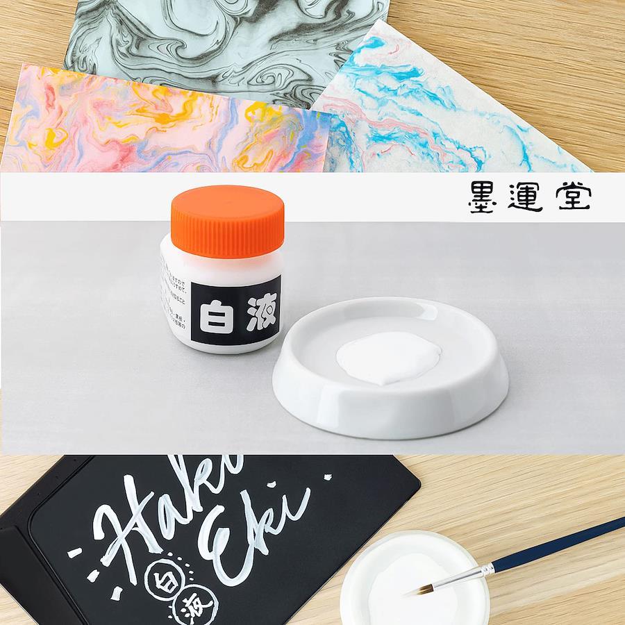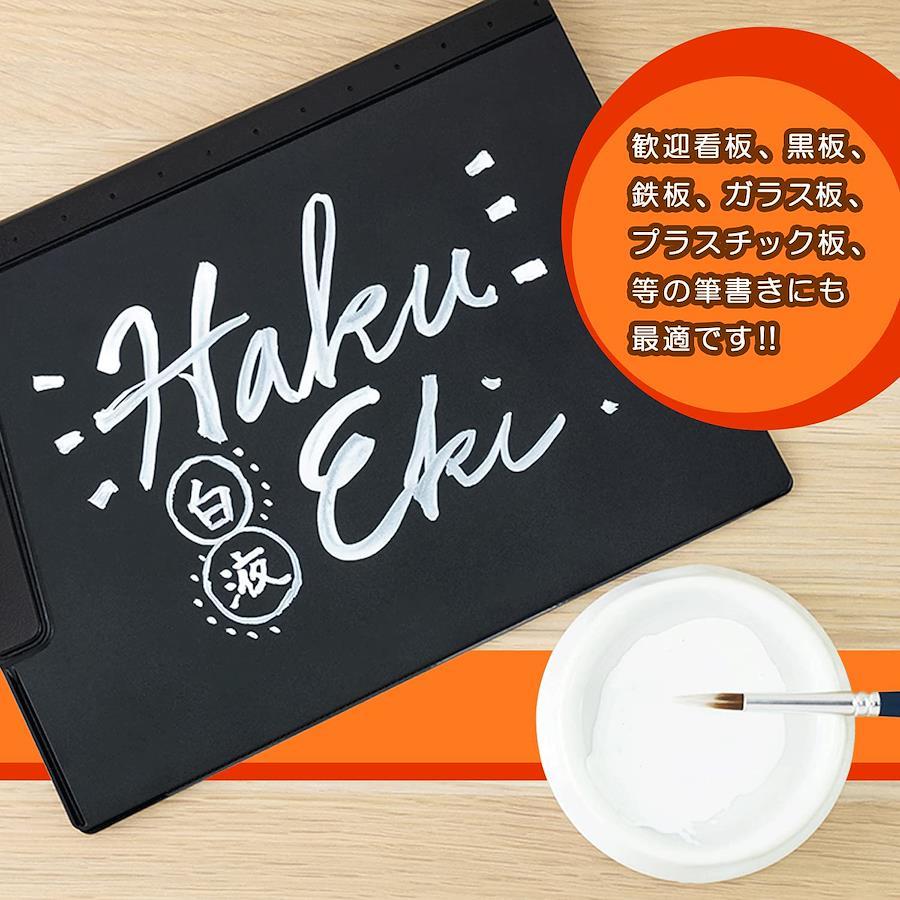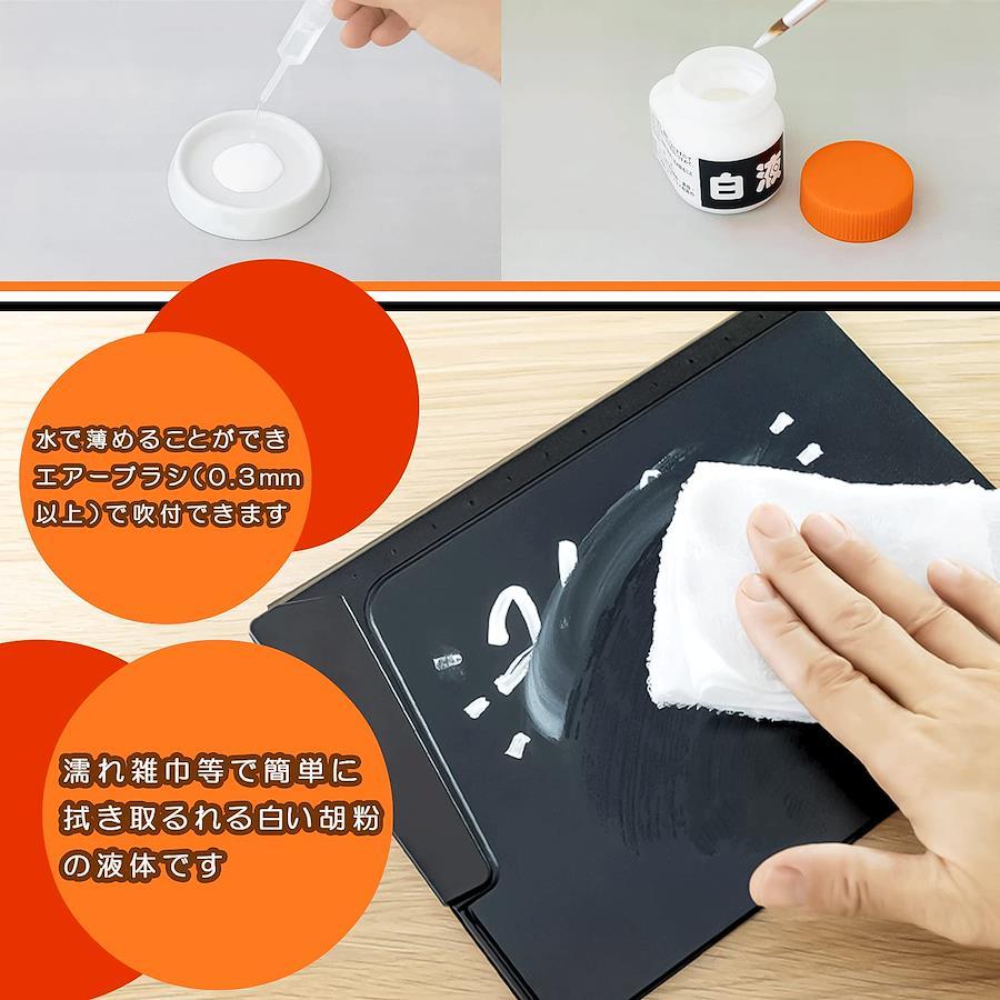 【白液】濡れ雑巾で簡単に拭き取れる。濃縮タイプで、ガラスやアクリル、化粧板等にも書くことが出来る。水で薄めてエアーブラシ(0.3mm以上)にも。彩液に混ぜて色の変化も楽しめる。