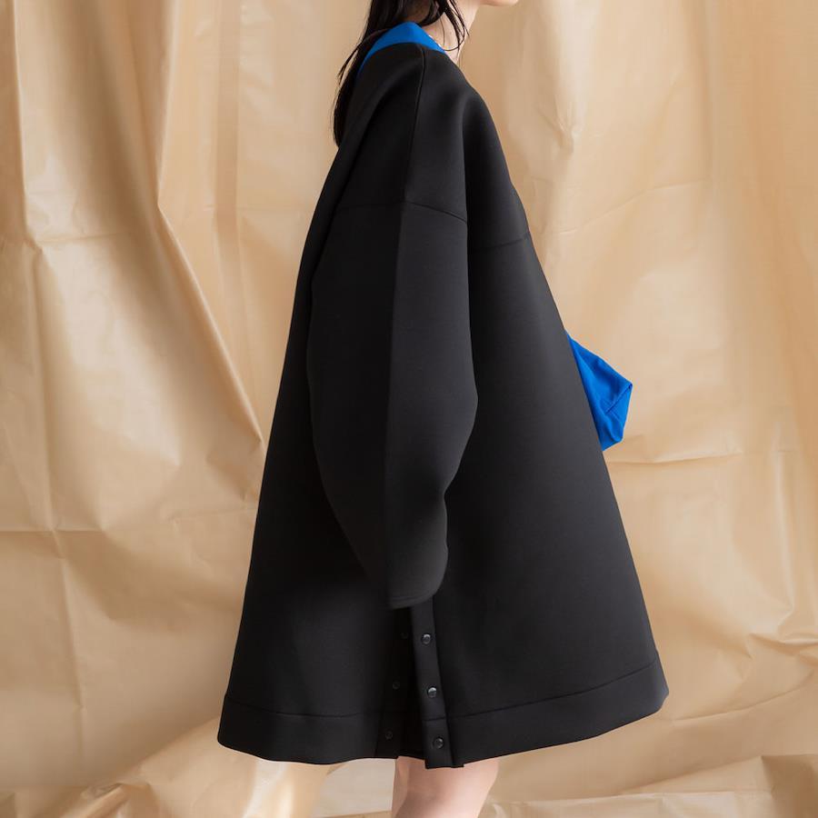 シンプルなAラインシルエットながらも、袖にタックを入れることで、変形アームシルエットを再現。また裾のスナップボタンで裾幅を調整でき、さらにAラインシルエットにも。