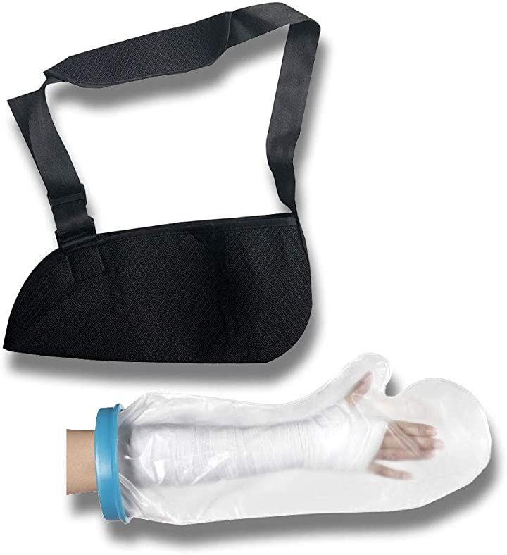 腕や手首の骨折・ケガをした際の固定具としてお使い頂ける肩掛け用アームホルダーと、シャワーや風呂への入浴時に包帯やギブスを濡らさないようにするための防水仕様のギプスカバーの2点セットです。