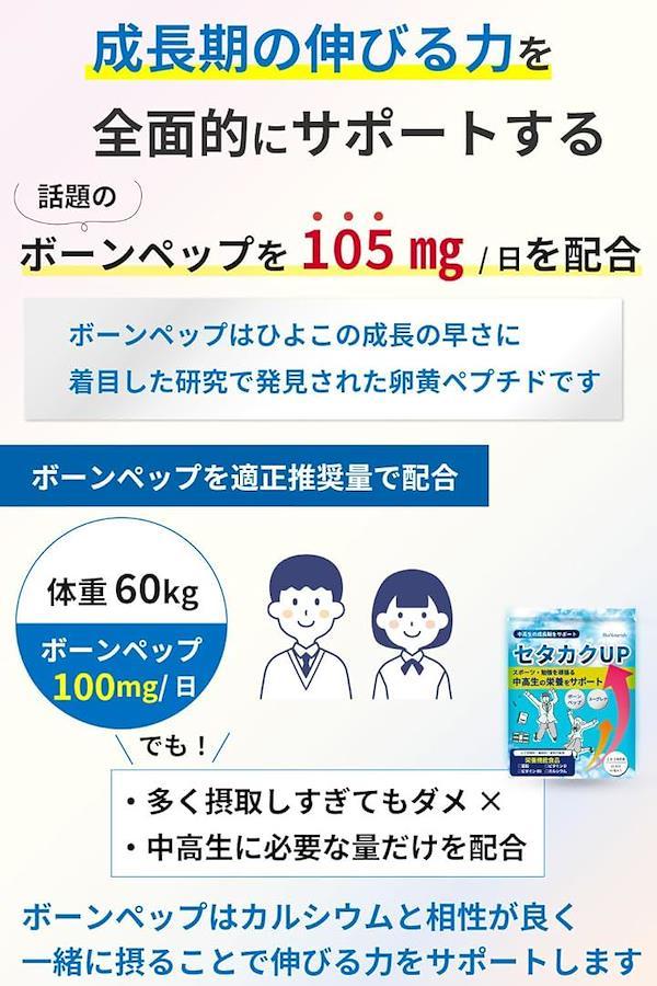 ボーンペップ(メーカー推奨量基準配合)はカルシウム(栄養機能食品)との相性が良く、一緒に摂ることで伸びる力をよりサポートします。
