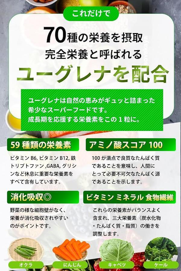 さらに、スーパーフードといわれるユーグレナを贅沢配合し、他にはない成長期に特化したサプリメントです。