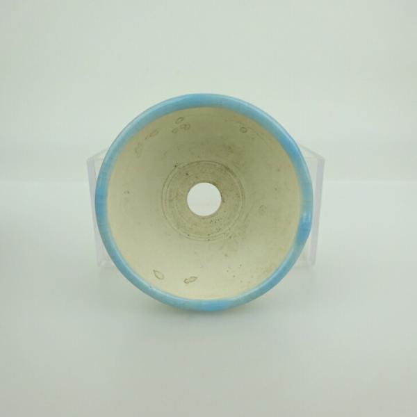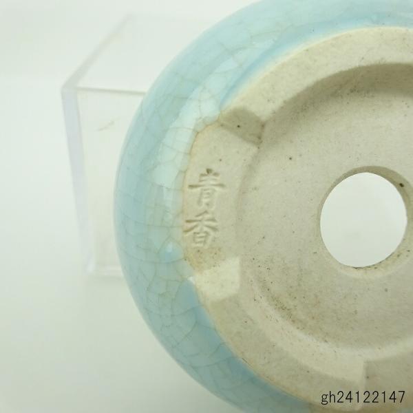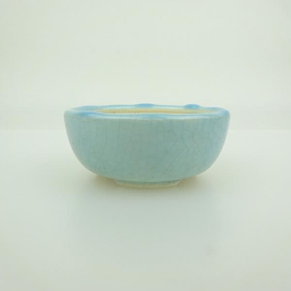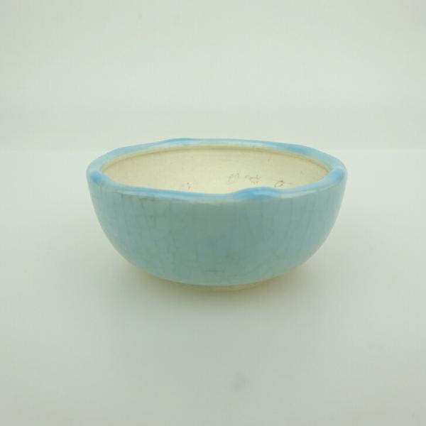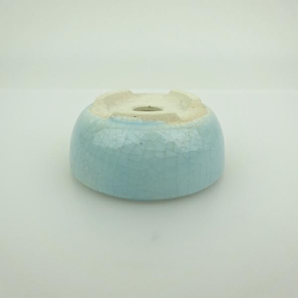 Bonsai pot, small, blue, approximately 6.1cm long, round, with cracked glaze. Actual item.
