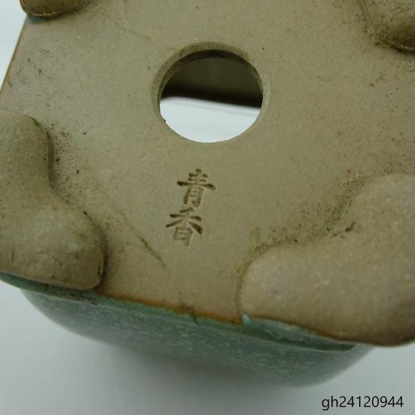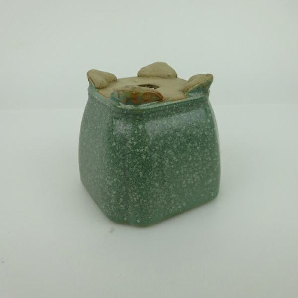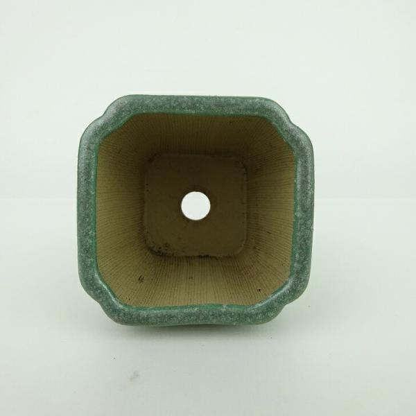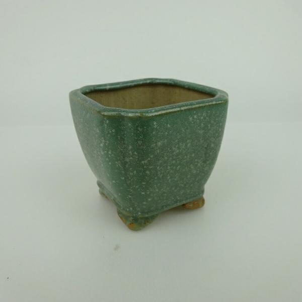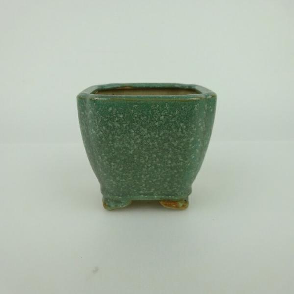 Bonsai pot, small, blue, approximately 6.8cm long, square, with corners, kumo-ashi (cloud feet), underband, glaze. Actual item.