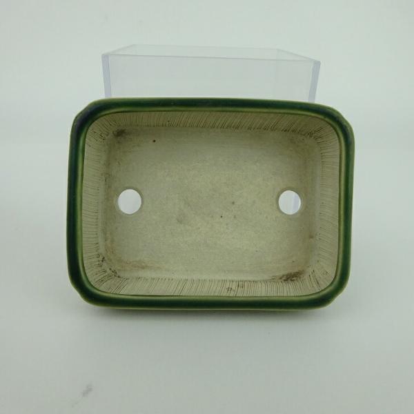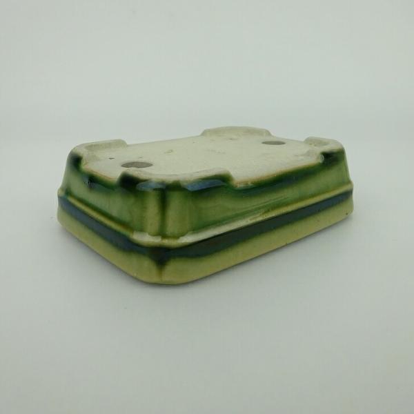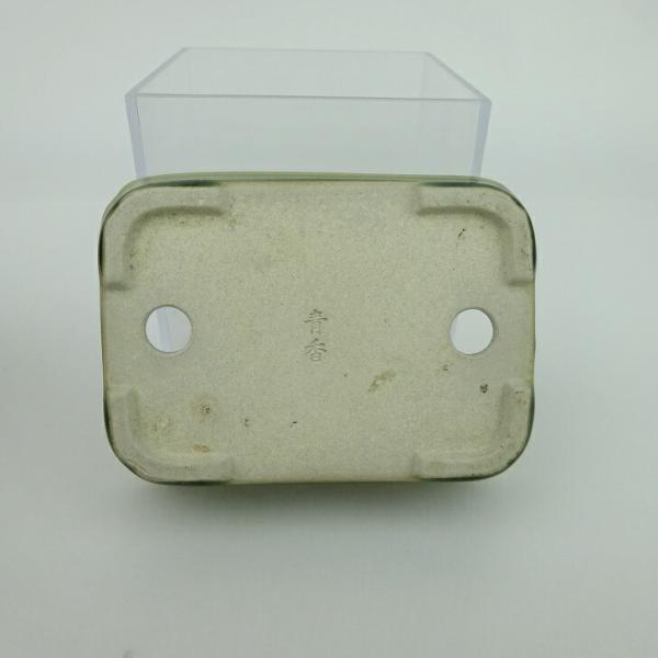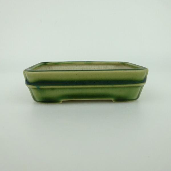 Bonsai pot, small, blue-scented, approximately 9.5cm long, rectangular, with a central band and corners, glazed. Actual product.