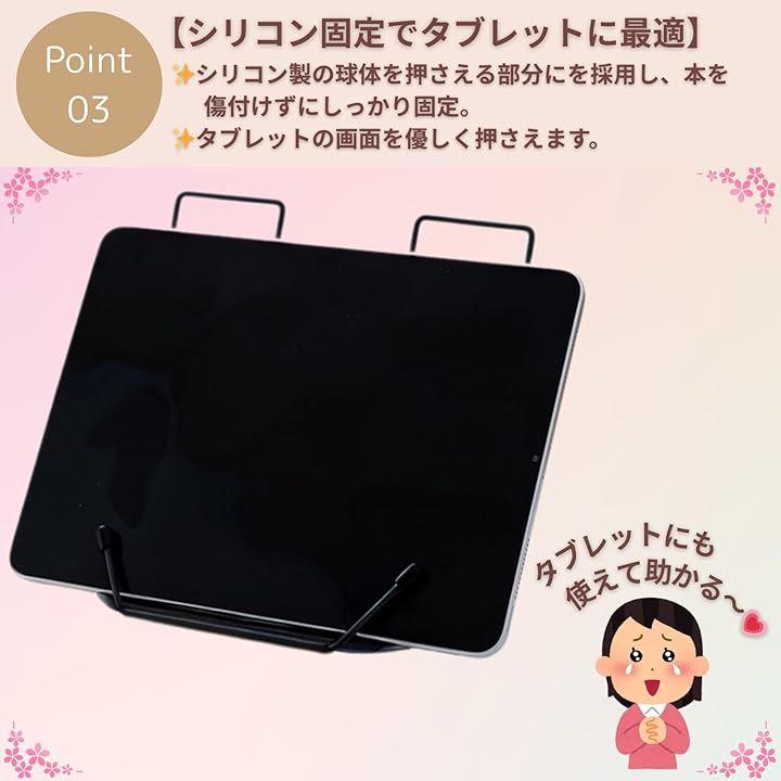 「安定して本を固定できるブックスタンド」しっかりとページを押さえる設計で、本が倒れたり閉じたりすることを防止。