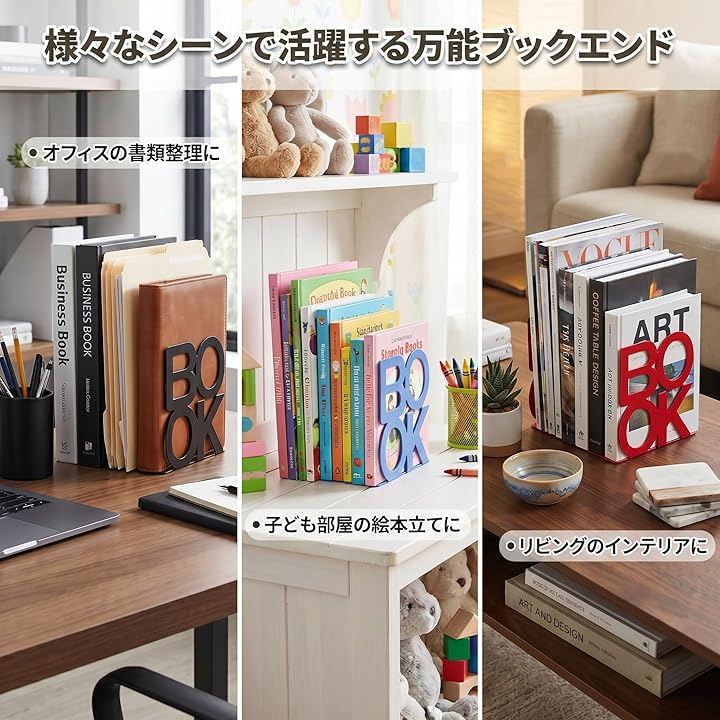 「本が倒れる悩み解決」オフィスの書類整理、書斎の書籍管理、子ども部屋の絵本立てまで幅広く活躍。