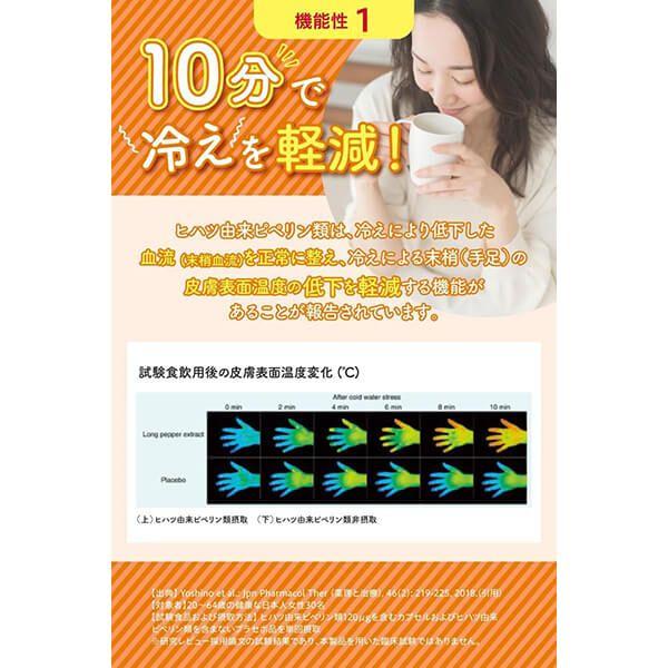 【届出表示】本品にはヒハツ由来ピペリン類が含まれます。ヒハツ由来ピペリン類は冷えにより低下した血流(末梢血流)を正常に整え、冷えによる末梢(手足)の皮膚表面温度の低下を軽減する機能があることが報告されています。また、脚のむくみが気になる健常な女性の夕方の脚のむくみ(病的ではない一過性のむくみ)を軽減する機能があることが報告されています。