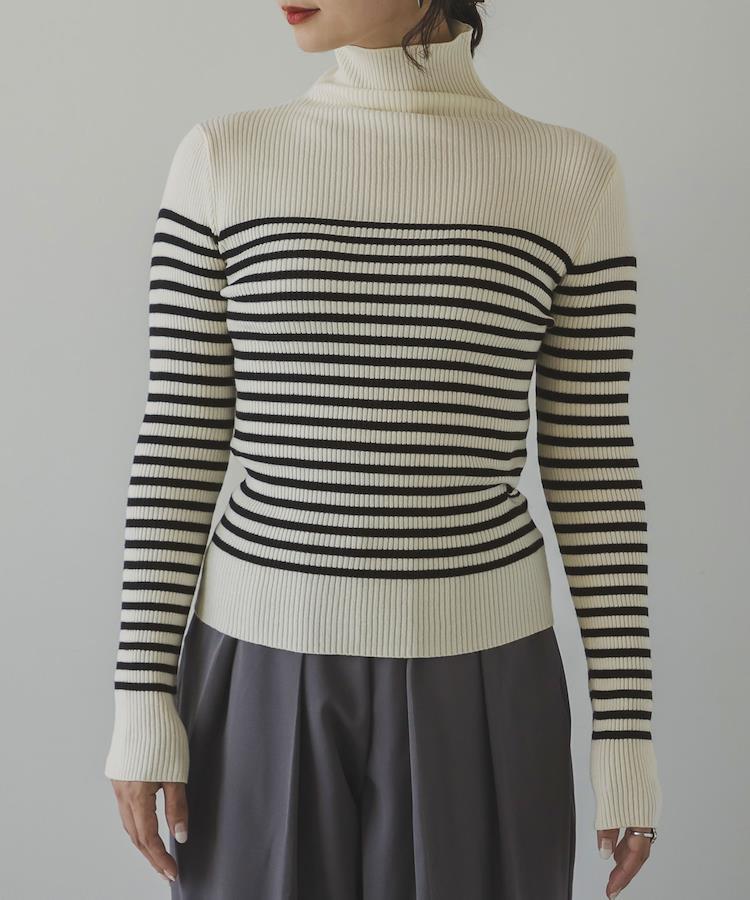 ちょっとしたコーデのアクセントになるパネルボーダーのリブニット。