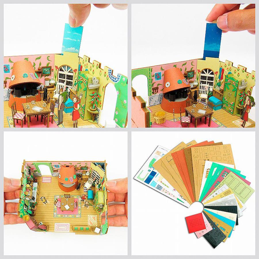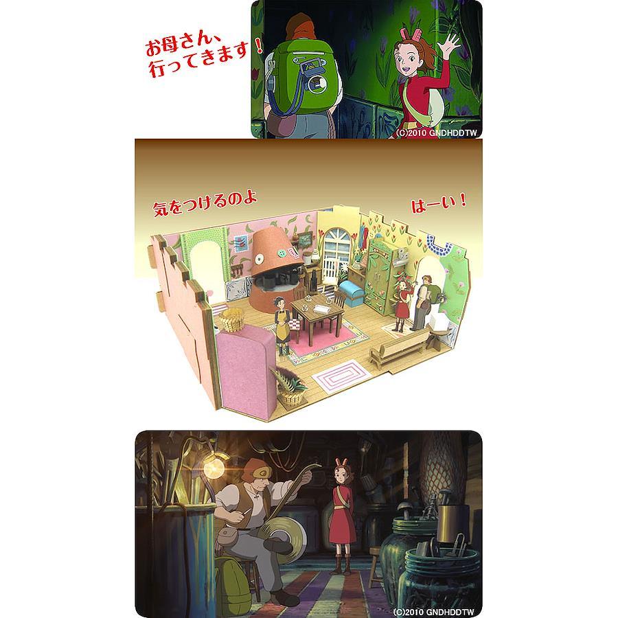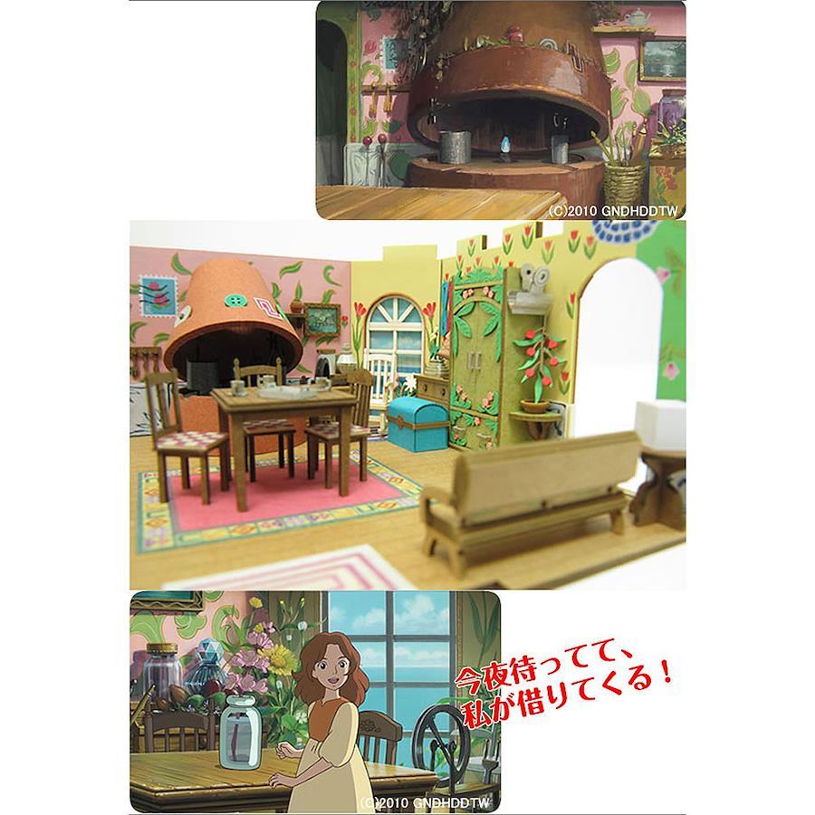 みにちゅあーとキットセット内容:レーザーシートA〜W(23枚)、 壁面シート (2枚)、プラ板(1枚)、 組み立て説明書完成時サイズ:W120×D102×H48mm対象年齢:12才以上組み立て所要時間:約25時間企画:スタジオジブリ・株式会社さんけい映画「借りぐらしのアリエッティ」より【アリエッティの家】