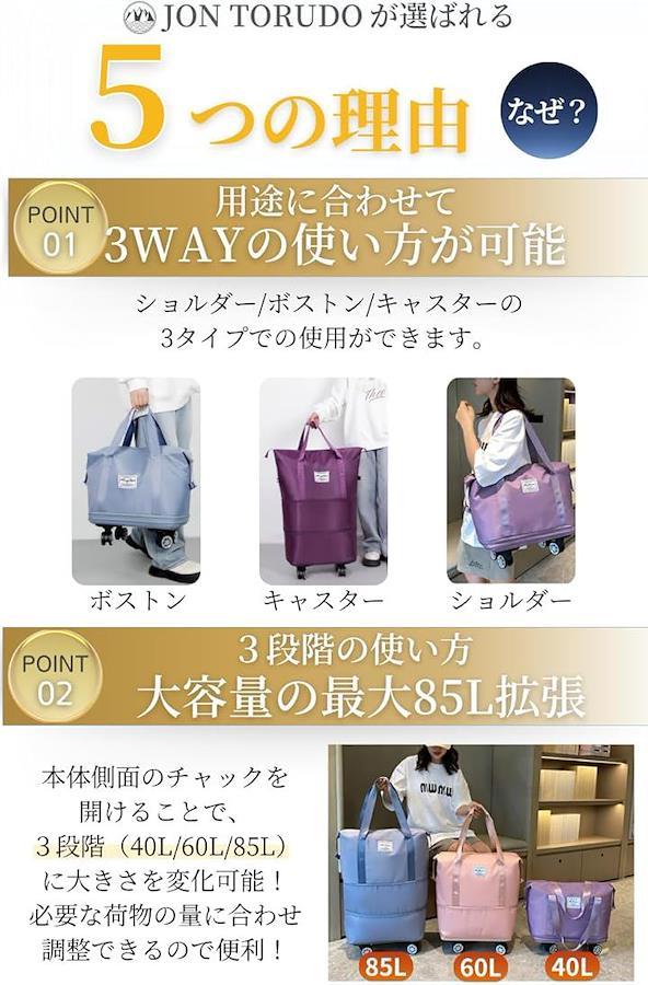 バッグ容量の3段階拡張: チャックを開けることで、3段階に大きさを拡張可能です(40L/60L/85L)。