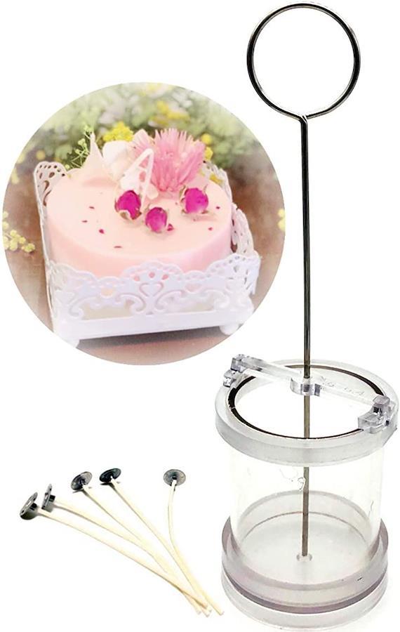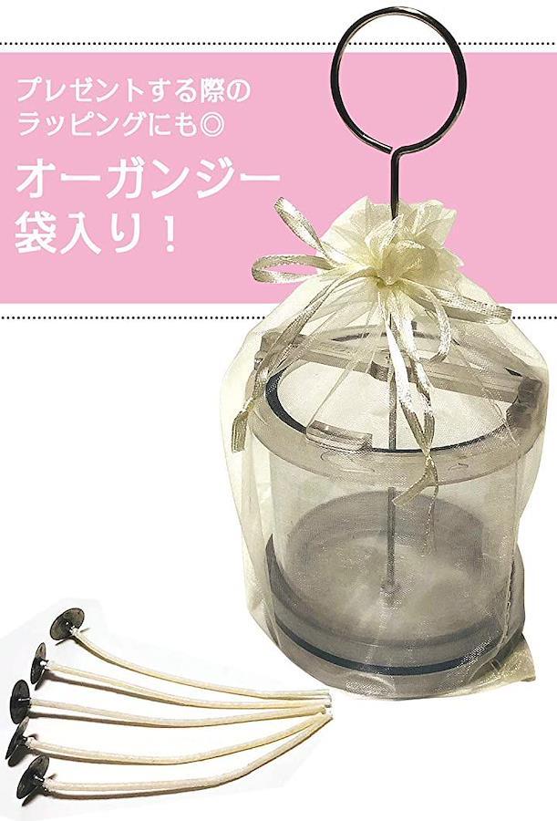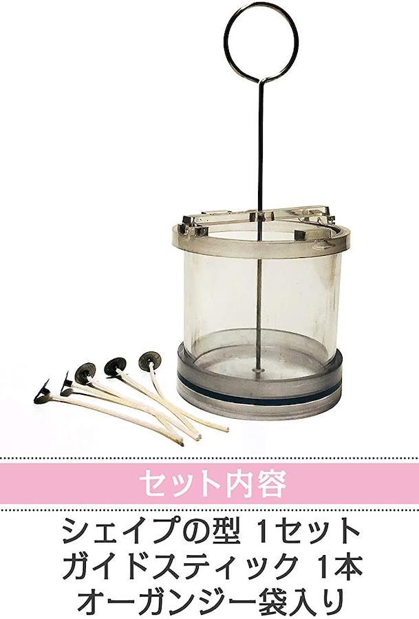 ・「フォルム・サイズ」円柱 完成最大サイズ 直径 約6cm高さ7.5cm 「セット内容」キャンドル型 1セット+ガイドスティック(キャンドルが固まった後に芯を通す場合のガイド穴を残すための器具です) +ガイドリング 1個、 オーガンジーバッグ入り * 円柱タイプにはガイドスティックを中心に固定する ガイドリングも付属します